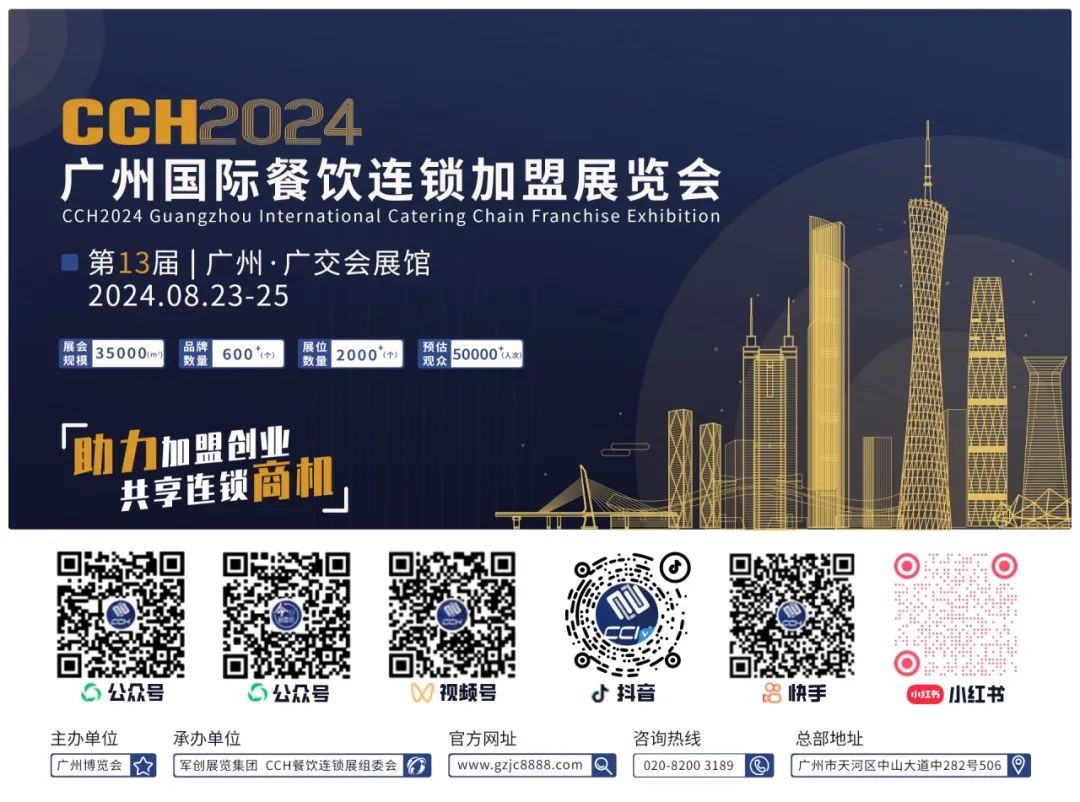 2024年8月23-25日,将共有600+品质商家、50000+专业观众共同期待第13届CCH广州国际餐饮连锁加盟展览会的到来!