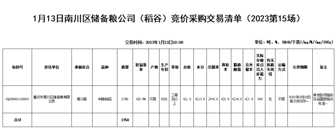 受重庆市南川区储备粮有限公司委托,重庆市粮油批发市场有限责任公司(即国家粮食重庆交易中心,以下简称“批发市场”)定于2023年1月13日10:00举办南川区储备粮公司(稻谷)竞价采购交易会,现将有关事项公告如下:2. 产地、年限及数量:产地不限,2022年产中晚籼稻2750吨。4. 交货地点:重庆市南川区储备粮有限公司南川库。5. 质量要求:一是符合国家粮食质量标准三等及以上质量标准,其中:出糙率≥76.0%;黄粒米≤0.5%;水分≤13.5%(水分在13.6%-14.0%之间的,每超0.1%扣量0.12%,水分超过14.0%拒收);杂质≤1.0%(杂质超标,需整理达标后入库,筛下物由卖方承担,超1.5%拒收);谷外糙米≤1.8%;品种互混率≤2.0%。二是符合稻谷储存品质判定规则(GB/T20569-2006)宜存标准,其中脂肪酸值≤18.0mgKOH/100g。三是符合食品安全标准食品中真菌毒素限量(GB2761-2017)指标,其中黄曲霉毒素≤5.0ug/kg。四是符合国家卫生标准食品中污染物限量(GB2762-2017)指标,其中镉≤0.18mg/kg,无机砷≤0.2mg/kg。五是符合食品安全国家标准食品中农药最大残留限量(GB2763-2021)指标。六是其他各项指标必须符合国家相关标准,无虫蛀,无异味,无活虫。七是严禁掺杂以前年度陈粮。八是卖方交货时,必须向买方提供本批次粮食一个月以内的由有资质的检验机构出具的质量检验报告。6. 数量、质量验收:数量以重庆市南川区储备粮有限公司南川库地磅数量为准;要求短溢装率≤0.5%。质量以到库综合扦样检验为准。粮食到达交货地点后,买方(或买方指定的存储库点企业)进行初检,初检结果仅作为是否入库的初步判断依据,不作为验收时是否合格的依据。对初检合格的粮食方能入库,对初检不合格的粮食可拒收。标的粮食入库完毕后,整仓质量经重庆具有国家资质的专业质检机构对粮食质量进行检验,该检验结果作为双方验收依据。7. 本次交易清单附后。具体交易品种和数量等信息如有变化,以即时公告及交易清单为准。1. 报名资格:国内具有粮油生产、经营资格的企业且在国家粮食电子交易平台注册的有效会员。2. 报名时间:2023年1月13日8:00前。报名参与交易即视作全面承认并遵守《重庆市地方政府储备竞价采购交易规则》和交易公告、交易清单等要求。1. 本次竞价交易使用国家粮食交易平台地储交易系统,2023年1月13日10:00通过网络对委托标的依次按交易节进行交易。请报名参加竞价交易的会员按时登录国家粮食交易中心官网(www.grainmarket.com.cn)→点击网页上方“请登录”或右方“用户中心”进行会员登录→点击“交易”板块→选择“重庆市场”→1月13日南川区储备粮公司(稻谷)竞价采购交易专场。1. 保证金的收取和释放:参与竞价交易的买卖双方须交纳保证金210元/吨(其中:履约保证金200元/吨和交易保证金10元/吨)。卖方保证金须在竞价采购交易会开始前2个小时汇至批发市场指定银行账户;买方保证金须在提交委托交易清单当日汇至批发市场指定银行账户。单笔合同交割完毕后,保证金释放。如合同部分交割,该合同数量的所有保证金处于冻结状态。2. 保证金转入:汇款时请备注“保证金”,待资金到账后,进入系统“用户中心”的资金界面,点击用户名称下方的“交易账户:明细”,将足额保证金“转入”重庆市场。3. 交易手续费:按成交金额的2.0‰向卖方收取。1. 成交价格:重庆市南川区储备粮有限公司南川库仓前交货价。2. 合同签订:自成交之日起3个工作日内买卖双方在交易系统内签订电子购销合同或以邮寄、扫描等方式签订,如逾期未签订购销合同,则对违约方作违约处理。3. 入库及付款:卖方须在2023年3月20日前交货完毕。买方须于成交之日起按进度将货款一次或分批汇入批发市场指定银行账户。当货物到达交货地点后,由重庆市南川区储备粮有限公司检验人员检斤验质。4. 结算:粮食初检验收合格入库后,买卖双方签订《验收确认单》,批发市场按《验收确认单》数量在3个工作日内支付卖方90%货款。合同执行完毕并经重庆具有国家资质的专业质检机构检验合格后以及收到卖方开具发票后,买卖双方再次签订《验收确认单》,批发市场在3个工作日内按《验收确认单》将剩余货款拨付给卖方。2. 开户银行:中国农业银行股份有限公司重庆九龙坡中梁山支行 3. 账 号:31-0707010400088881. 本场交易规则详见“重庆粮网”(www.grainmarket.com.cn/centerweb/region/CQ)、“重庆粮食集团”官网(www.cqgrain.com)《重庆市地方政府储备竞价采购交易规则》,与此规则不一致的以本次公告为准。2. 会员成交后到委托方指定交货地点交货时,需遵守当地的疫情防控政策,做好疫情防控工作。3. 各会员单位发现以陈顶新、转圈粮、套取财政补贴、人为设置障碍造成入库难等违法违规问题的,请拨打12325举报。4. 市场交易部联系电话:023-65269777 023-65269283 ▶ 网站 | www.grainmarket.com.cn/centerweb/region/CQ