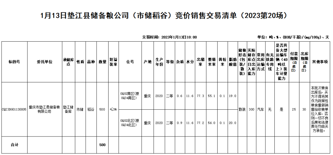 受重庆市垫江县储备粮有限公司委托,重庆市粮油批发市场有限责任公司(即国家粮食重庆交易中心,以下简称“批发市场”)定于2023年1月13日10:00举办垫江县储备粮公司(市储稻谷)竞价销售交易会,现将有关事项公告如下:2. 产地、年限及数量:重庆2020年产稻谷500吨。3. 承储库点及仓号:垫江储备库0Q02号仓(原0Q34号仓)。4. 标的质量:以交易清单质量指标为准。有意向参与交易的会员可通过“重庆粮网”(www.grainmarket.com.cn/centerweb/region/CQ)、“重庆粮食集团”官网(www.cqgrain.com)→资料下载→《竞价销售粮油看样单》路径,填写后加盖公章邮寄或扫描至批发市场,经批发市场审核盖章后,提前实地查看粮食实物质量和路况、出库条件等情况,确保所竞买的粮油符合自身使用用途,自主确定是否购买,并承担竞买后相应责任和市场风险。如未提前看样或看样后参与交易的,均视同认可标的质量,成交后不得再对质量提出异议。5. 本次交易清单附后。具体交易品种和数量等信息如有变化,以即时公告及交易清单为准。1. 报名资格:国内具有粮油生产、经营资格的企业或个人且在国家粮食交易平台注册的有效会员。2. 报名时间:2023年1月13日8:00前。报名参与交易即视作全面承认并遵守《重庆市地方政府储备竞价销售交易规则》和交易公告、交易清单等要求。1. 本次竞价交易使用国家粮食交易平台地储交易系统,2023年1月13日10:00通过网络对委托标的依次按交易节进行交易。请报名参加竞价交易的会员按时登录国家粮食交易中心官网(www.grainmarket.com.cn)→点击网页上方“请登录”或右方“用户中心”进行会员登录→点击“交易”板块→选择“重庆市场”→“ 1月13日重庆市地方储备粮(垫江稻谷)竞价销售交易专场”。1. 保证金的收取和释放:参与竞价交易的买卖双方各须交纳保证金110元/吨(其中:履约保证金100元/吨和交易保证金10元/吨)。买方保证金须在竞价销售交易会开始前2个小时汇至批发市场指定银行账户;卖方保证金须在提交委托交易清单当日汇至批发市场指定银行账户。单笔合同交割完毕后,保证金释放。如合同部分交割,该合同数量的所有保证金处于冻结状态。2. 保证金转入:汇款时请备注“保证金”,待资金到账后,进入系统“用户中心”的资金界面,点击用户名称下方的“交易账户:明细”,将足额保证金“转入”重庆市场。3. 交易手续费:按成交金额的1.5‰向买方收取。1. 成交价格:为交易系统确认价格,即卖方承储库仓(罐)前散装车板交货价格,不含包装及整理费用,无出库费,无水、杂增扣量。如买方有包装以及整理要求,可与卖方协商,费用按照协商一致的标准另行结算。2. 合同签订:自成交之日起3个工作日内买卖双方在交易系统内签订电子购销合同或以邮寄、扫描等方式签订,如逾期未签订购销合同,则对违约方作违约处理。3. 付款及出库:买方自成交之日起25日内付款完毕,30日内出库完毕。买方成交后将货款一次或分批汇入批发市场指定银行账户。出库前,买方在“我的合同”中点击“支付货款”来完成出库通知单申请。批发市场收到申请后,及时审核并开具《出库通知单》。4. 结算:出库完毕后买卖双方签订《验收确认单》,由卖方送达批发市场,批发市场在2个工作日内按《验收确认单》办理货款结算。2. 开户银行:中国农业银行股份有限公司重庆九龙坡中梁山支行 3. 账 号:31-0707010400088881. 本次交易规则详见“重庆粮网”(www.grainmarket.com.cn/centerweb/region/CQ)、“重庆粮食集团”官网(www.cqgrain.com)《重庆市地方政府储备竞价销售交易规则》,与此规则不一致的以本次公告为准。2. 会员在交易前到委托方存储库点看样或成交后到委托方存储库点提货时,需遵守当地的疫情防控政策,做好疫情防控工作。3. 本批次粮食出库后,买方不得将其作为政策性粮食重新销售给收粮单位入库,否则一切不良后果和法律责任均由买方承担。4. 各会员单位发现以陈顶新、转圈粮、套取财政补贴、人为设置障碍造成出库难、不执行出库质量检验制度等违法违规问题的,请拨打12325举报。5. 市场交易部联系电话:023-65269777 023-65269283▶ 网站 | www.grainmarket.com.cn/centerweb/region/CQ