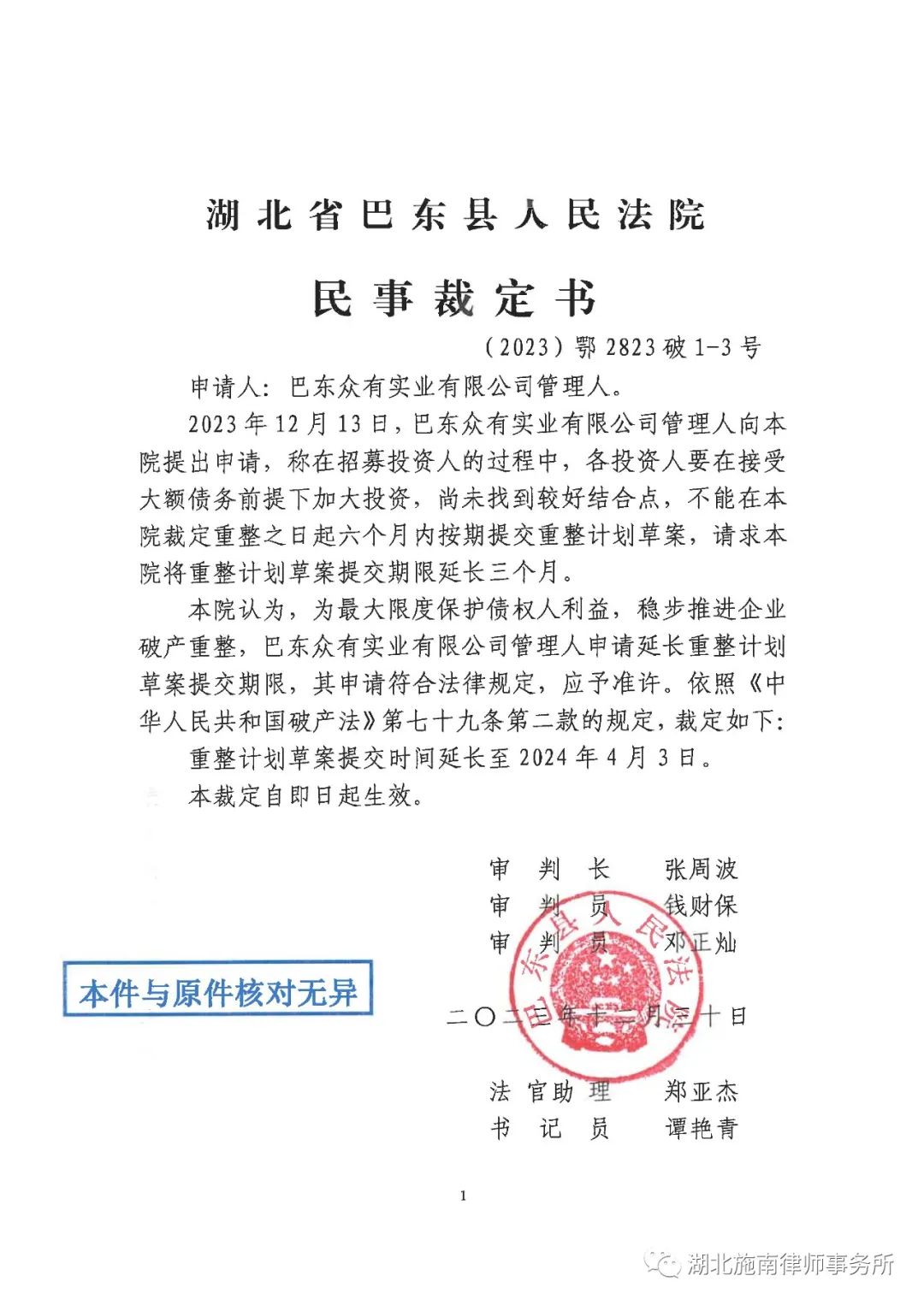 为最大限度地维护债权人利益,稳步推进巴东众有实业有限公司重整,经巴东县人民法院裁定准许,巴东众有实业有限公司重整期限延长至2024年4月3日。