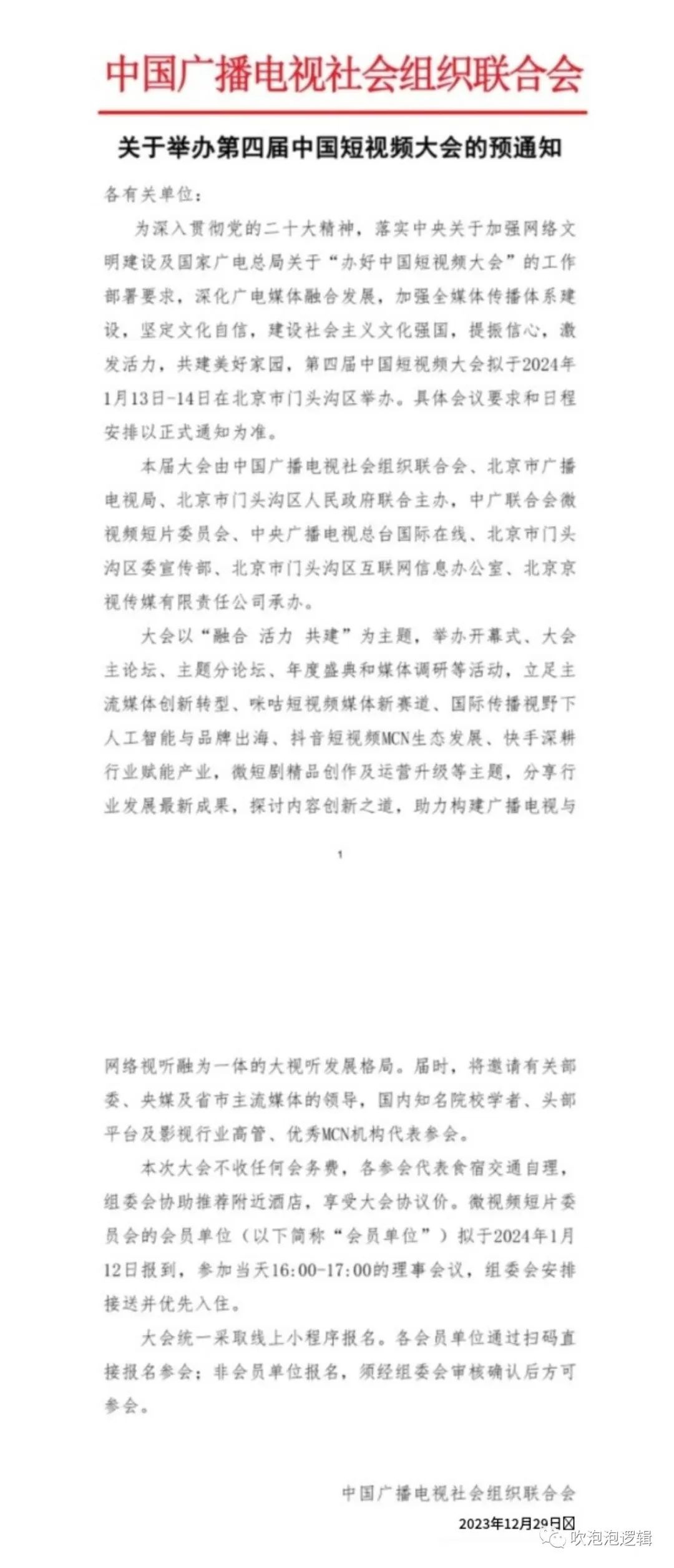 对了,前面写短剧时候,说过有个会快开了,就是那个有权部门:中国广播电视社会组织联合会主办的第四届中国短视频大会,广电总局领导、抖音、快手等平台的领导都会出席,讲的肯定都是正面积极的内容,也可以参考一下,时间在CES 2024结束后。