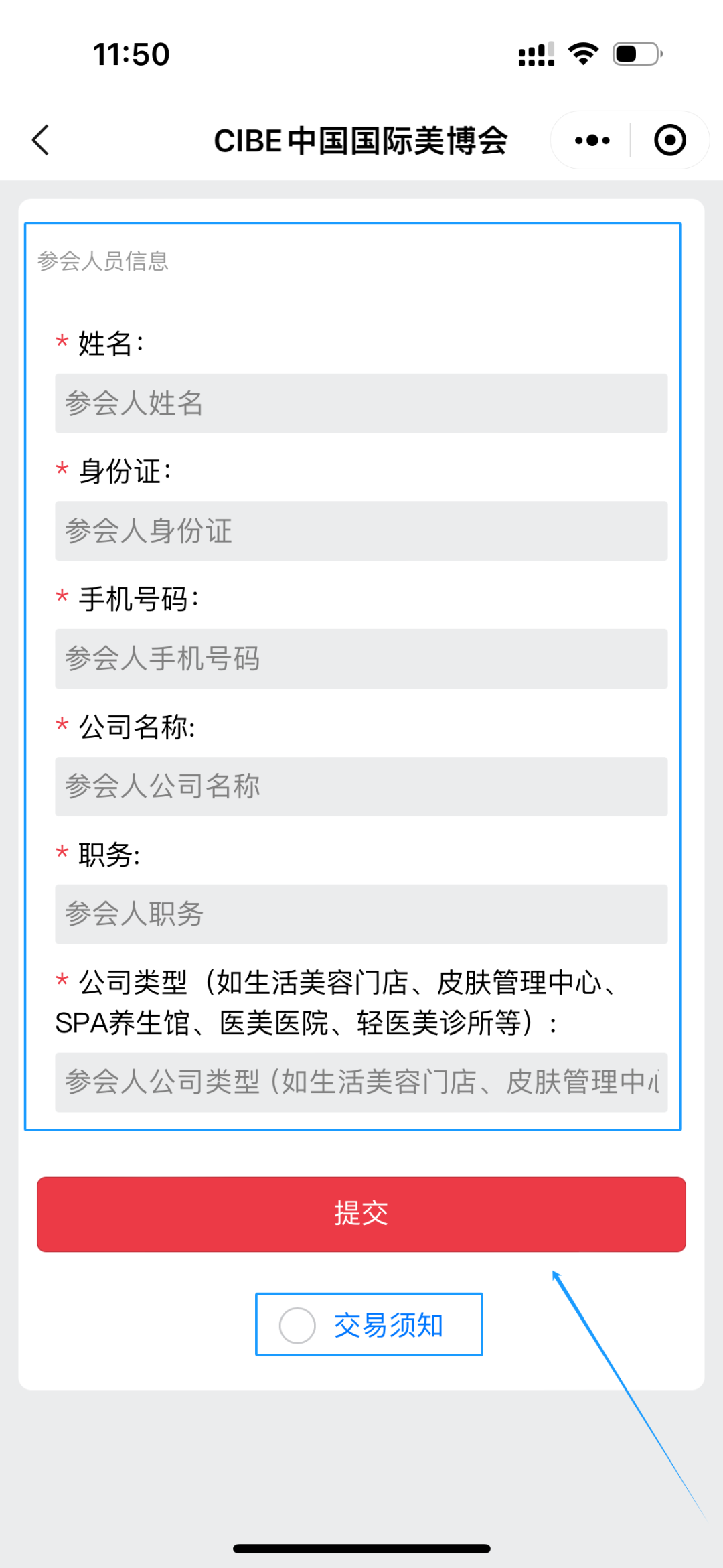 填写报名资料后,勾选“交易须知”,点击“提交”