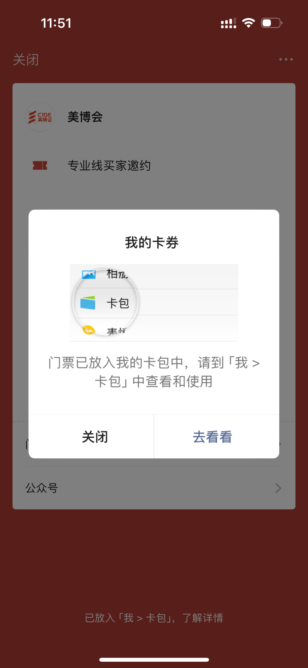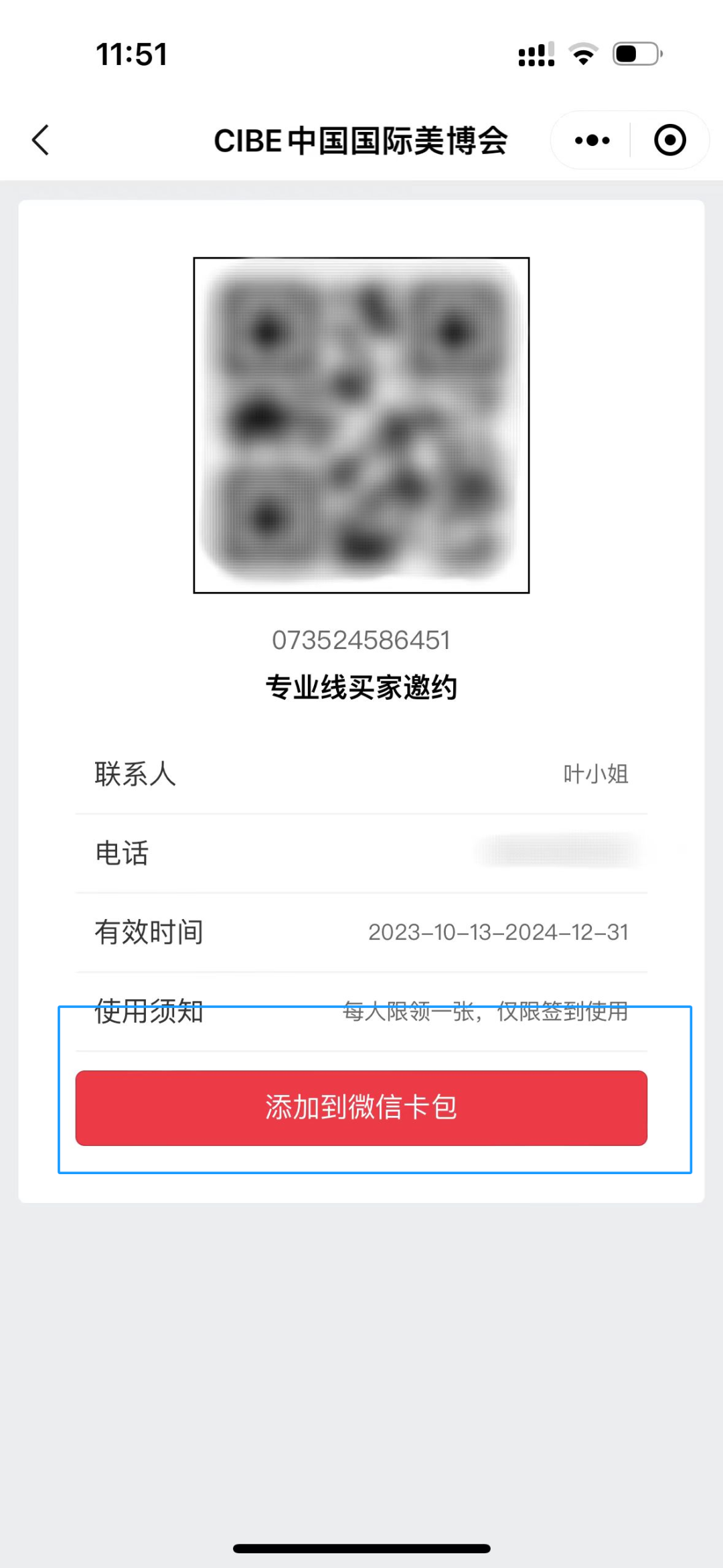 生成报名成功后二维码,点击“添加到微信卡包”