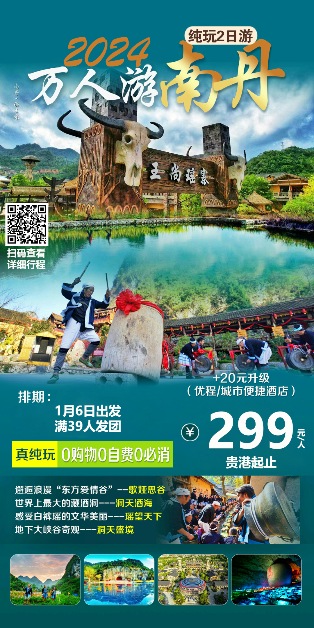 随后乘座换乘车前往【歌娅思谷·瑶王寨】,歌娅思谷瑶王寨位于南丹县里湖瑶族乡王尚屯,依托“千家瑶寨·万户瑶乡”项目打造神秘瑶寨,建设易地搬迁安置房、游客服务中心、瑶王府、赶圩广场、神秘文化游览区、服饰生态展览馆、村寨活动体验馆、民族体育馆、瑶王城商业街、千鼓瑶韵实景演出、特色酒店等,建成国内最具魅力的民俗风情旅游区。