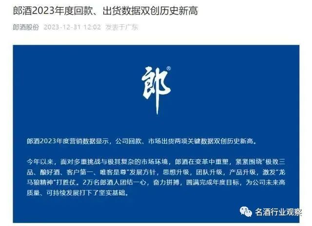 12月31日,郎酒股份发布消息,2023年度营销数据显示,公司回款、市场出货两项关键数据双创历史新高。今年以来,面对多重挑战与极其复杂的市场环境,郎酒在变革中重塑,紧紧围绕“极致三品、酿好酒、客户第一、唯客是尊”发展方针,思想升级,团队升级,产品升级,激发“龙马狼精神”打胜仗。2万名郎酒人团结一心,奋力拼搏,圆满完成年度目标,为公司未来高质量、可持续发展打下了坚实基础。