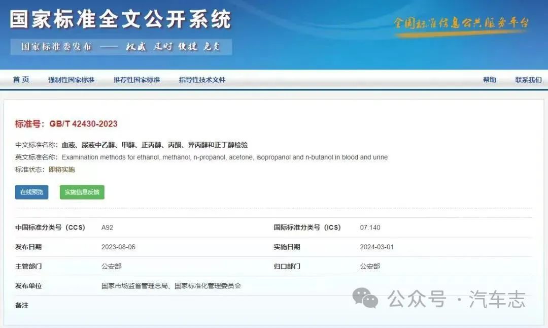2011年酒驾开始入刑,血液中的乙醇含量分两个等级,此次新国标更新为三个等级,同时标准更加严格。血液中乙醇含量超过20mg/100ml属于饮酒驾驶,旧国标中为50mg/100ml;血液中乙醇含量大于等于80mg/100ml就属于醉酒驾驶。酒驾新标准将于2024年3月1日开始实施。