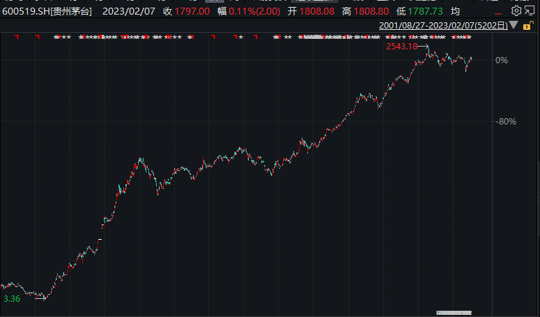 回顾历史,分阶段来看,在白酒行业“黄金十年”(2003-2012年)期间,该比值从4.16持续下降至2.23的低点,一定程度上体现白酒的定价权。随着价格的不断上涨也带动了股价上涨,实现了20年400倍的涨幅,如下图: