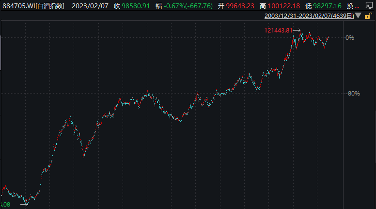尤其对茅台等酱香型白酒而言,年份越长,风味越佳,这导致茅台的品质会随时间相应提高。我们可看到,白酒指数具有穿越牛熊的特性,过去二十年是不断在创新高的,如下图: