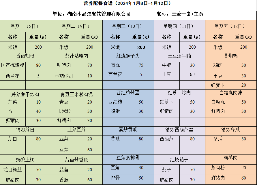 为进一步落实上级文件精神,加强学校配餐管理,确保学生学生营养均衡,提高学生就餐质量,现将长塘里思远小学选用的湖南木品烩餐饮有限公司一周菜谱带量进行公示,欢迎广大师生、家长提出宝贵意见。