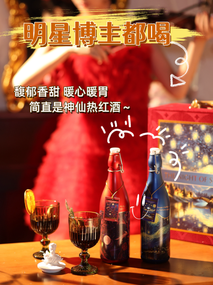 古典手提箱的造型,再加上艺术性的星空元素,真的格调满满。而且《星空》由梵高基金会正版IP授权,不是市面上劣质的仿品,节日送人或者自用,面子、仪式感都有了~而且现在下单,你不仅只有收到两瓶热红酒,套盒里还有:整套搭配在一起,氛围感满满,真的是凡尔赛高端送礼神器!!!难怪欧洲一上市就被疯抢一空,全球官网价1280,现在268元就能拿走,谁能不爱?!把梵高传世名作《星月夜》搬到了酒瓶上,瓶身设计是梵高酒庄新年限定❤️红?蓝配色。梵高星空点点的星光,包裹住整个瓶身,艺术感十足的同时增加了满满的新年氛围感。而且酒瓶喝完,我都都舍不得丢掉,可以拿来当装饰品哦~一套就可以喝到两种口味的地道德国??红酒,真的太棒了!!!梵高的这两瓶红酒,属于单喝甘甜,当热红酒更有一番风味。而且红酒在出厂的时候已经调配好了,不需要再加入冰糖等调味。简直又好喝又出片~不会煮热红酒的小姐妹也不用担心翻车~没有乱七八糟过重的八角肉桂中药味,入口是纯粹清甜〰️浓郁的果香和淡淡的肉桂~滋味甜美浓郁,又没有多少酒精度,捧在手里还觉得暖身暖心。