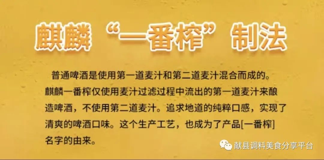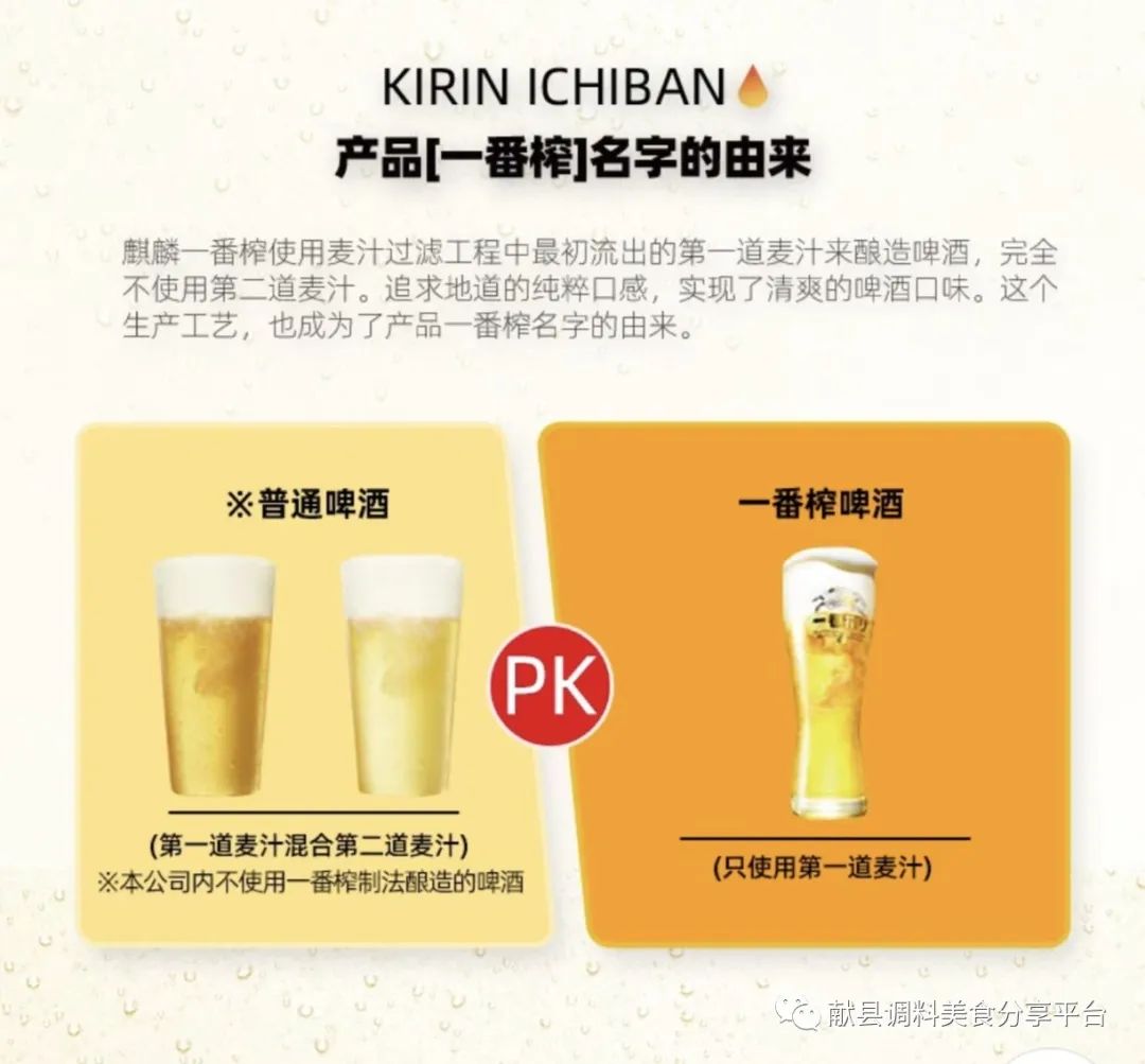 麒麟一番榨啤酒只提取第一道麦汁酿造,由于第一道麦汁中,从麦芽壳渗出的涩味成份较少,所以只提取第一道麦汁酿造的一番榨啤酒没有一般啤酒的涩味。