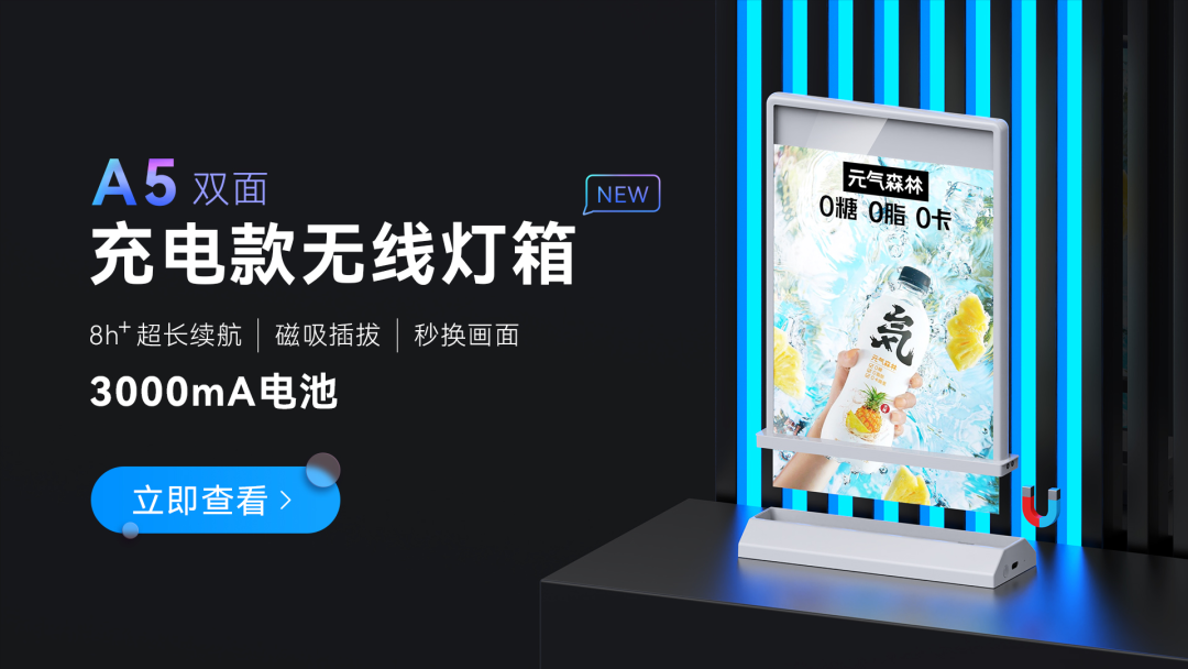 产品介绍:A5无线充电灯箱,磁吸连接,双面展示1分钟抽拉换画,8小时超长续航,适用于所有商业店铺。