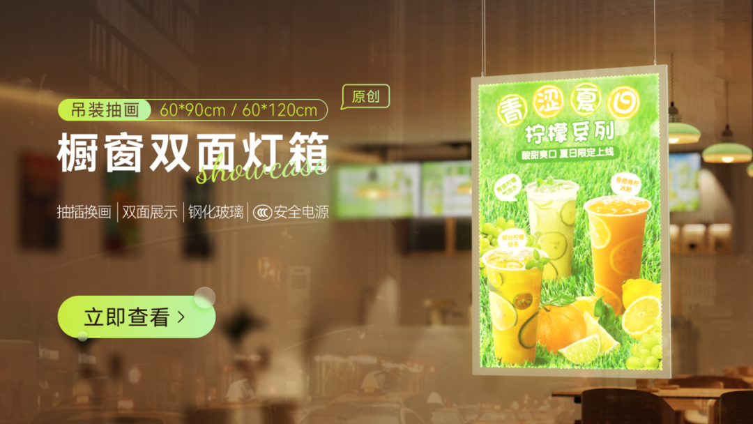 产品介绍:橱窗双面灯箱,一抽一插轻松换画,双面展示,餐饮店、服装店、零食店等商业店铺都可使用。