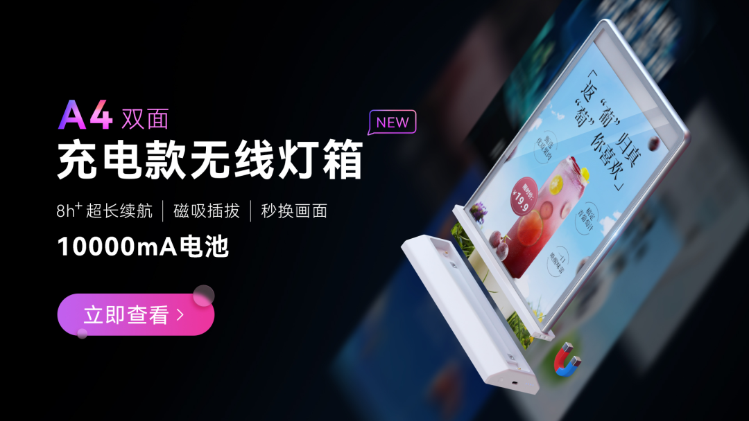产品介绍:A4无线充电灯箱,磁吸连接,双面展示1分钟抽拉换画,8小时超长续航,适用于所有商业店铺。