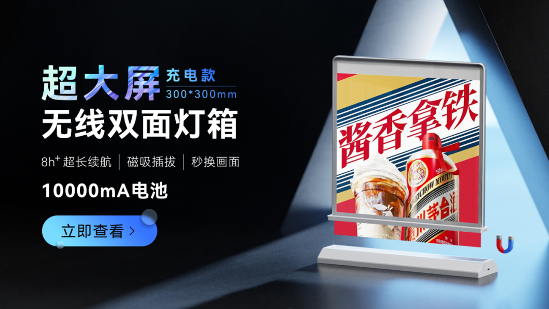 产品介绍:超大屏无线双面充电灯箱,磁吸连接,1分钟抽拉换画,8小时超长续航,适用于所有商业店铺。
