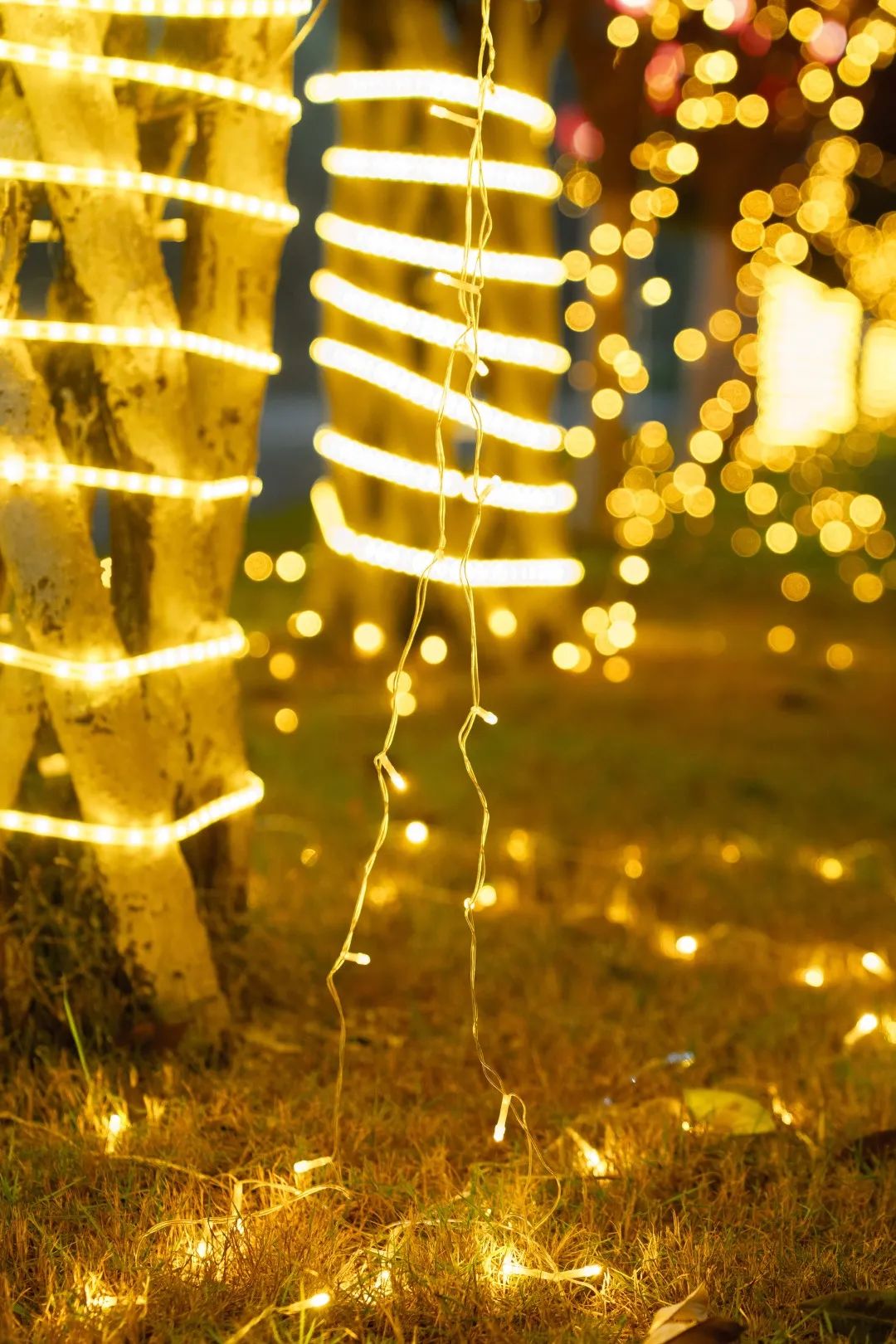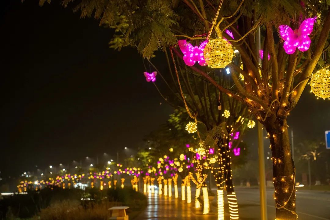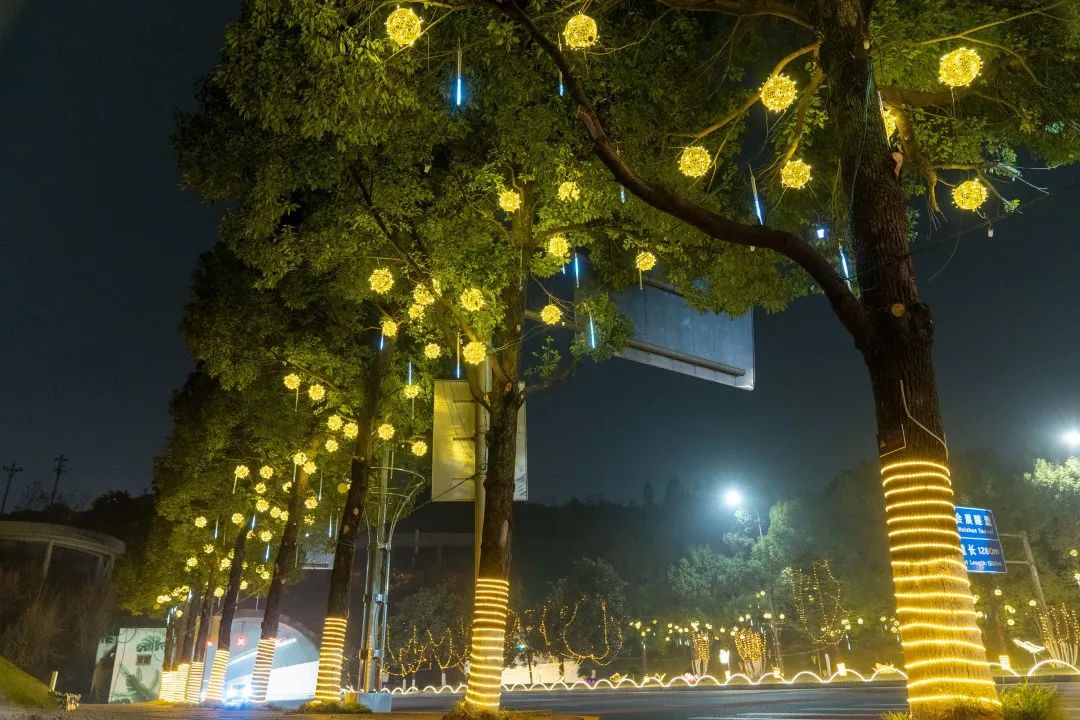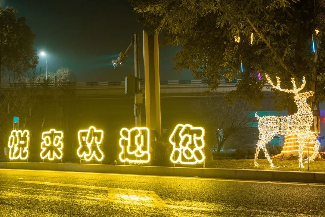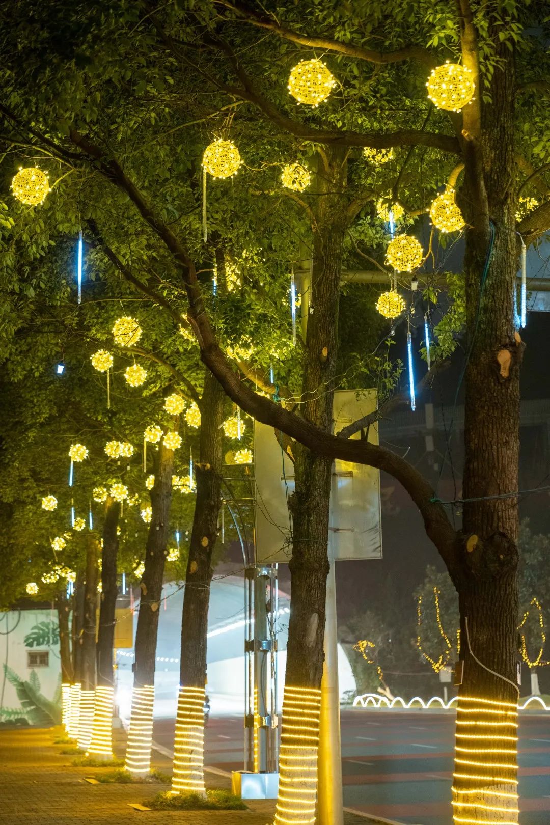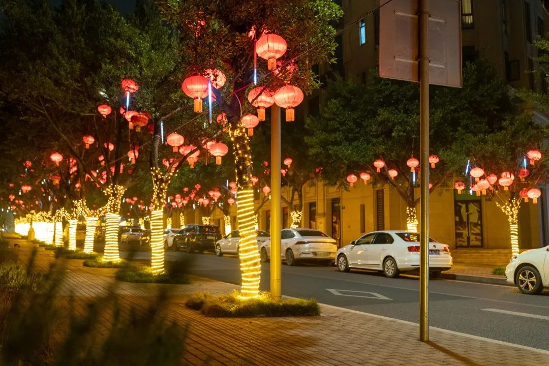 悦融路以红灯笼、星星挂件、灯带为点缀