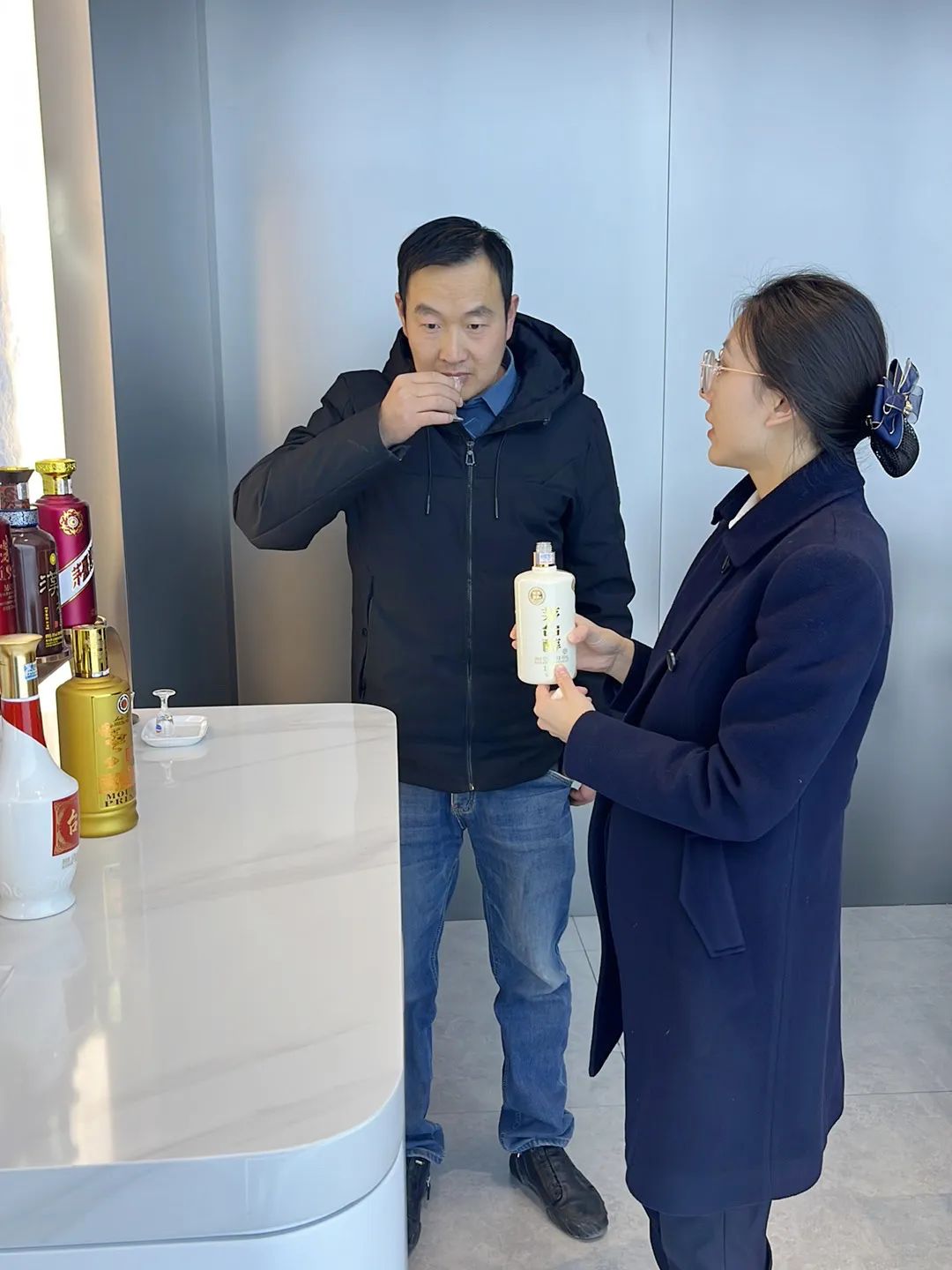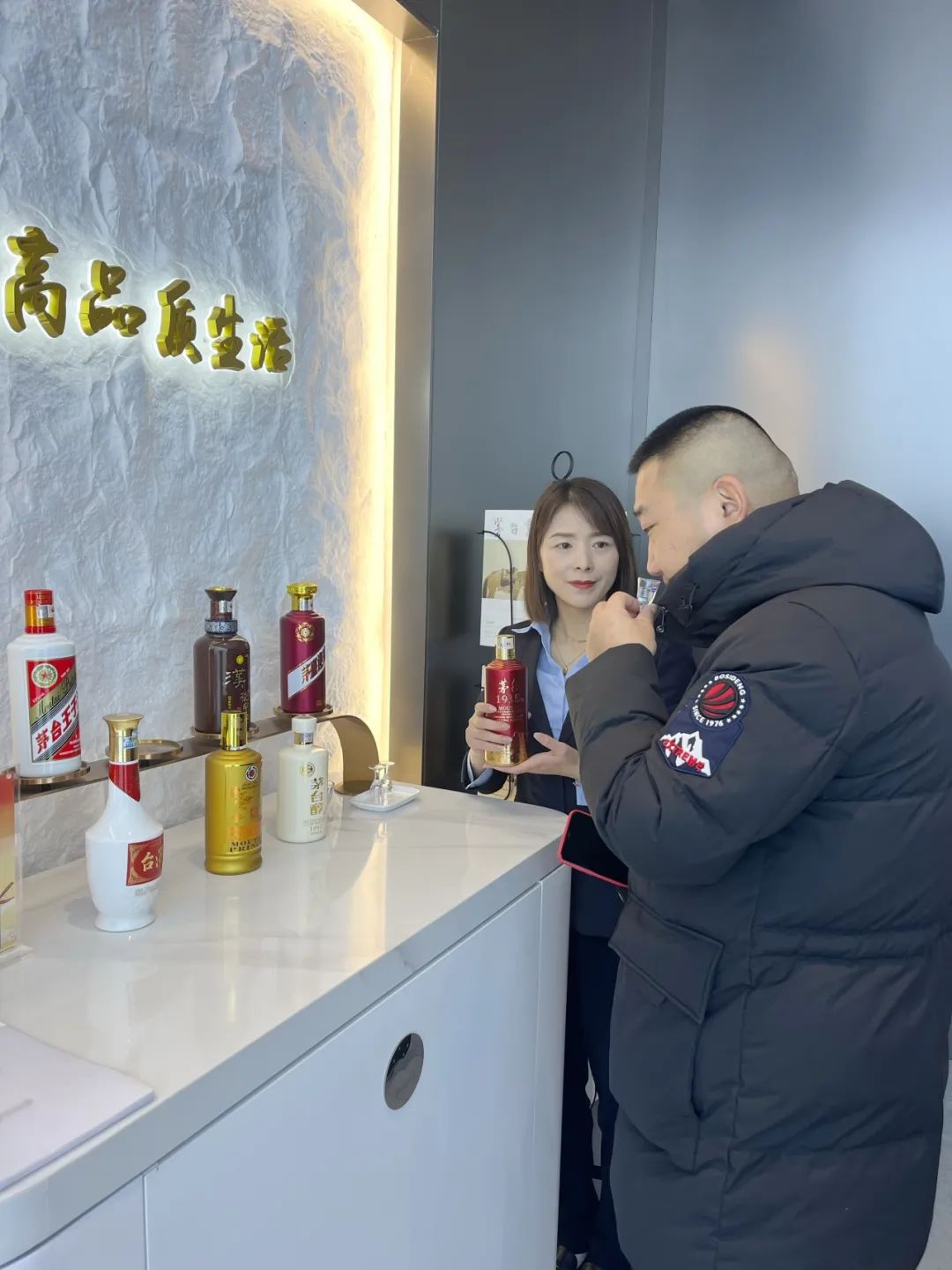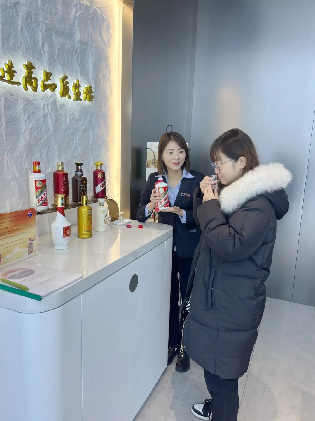 活动期间,店内工作人员诚邀每一位进店购酒的顾客参与店内品饮活动。品鉴环节,客户通过文化宣讲员介绍的“观、闻、尝、悟”四个不同层次的体验,品味茅台独特的醇香。