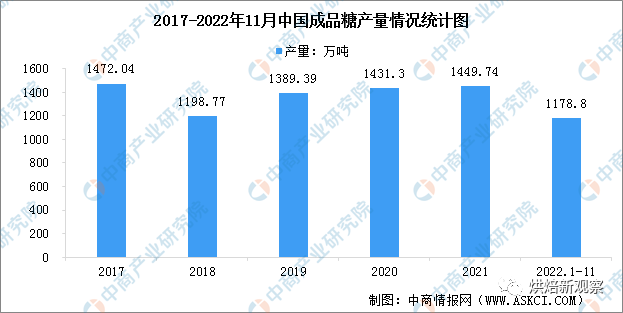 食品工业、饮料业、饮食业等用糖行业的快速发展,推动了我国食糖工业消费的稳步上升。在国内市场强劲需求的推动下,我国成品糖产业整体保持平稳发展。数据显示,2022年11月全国成品糖当月产量与去年同期相比下降,11月全国成品糖产量为94.1万吨,同比下降11.3%;2022年1-11月全国成品糖产量1178.8万吨,同比增长0.5%。