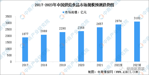 随着我国人均消费水平的增长、餐饮消费结构的调整以及生活节奏加快,人们对烘焙食品的接受度不断上升,需求也愈发的多元化,消费者饮食习惯的改变使得烘焙食品逐渐成为了消费者主流的饮食选择,进而推动了我国烘焙行业的发展。数据显示,2021年我国烘焙食品行业市场总规模达到2657亿元,近5年CAGR为9.08%,预计2023年我国烘焙行业市场规模将达到3102亿元。