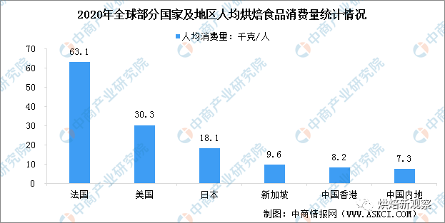 烘焙食品一直是欧美国家的主流早餐和主食,相较之下,烘焙食品进入我国较晚,发展时间较短,且烘焙食品还未被当作正餐食用,因而国内人均消费水平与发达国家和地区还有较大差距。据欧睿国际统计,2020年我国内地人均烘焙食品消费额仅为约24美元/人,人均烘焙食品消费量为7.3千克,远低于其他国家和地区,中国烘焙人均消费量有望进一步提高。