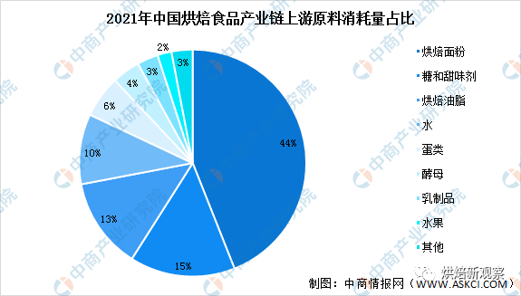 烘焙食品是以面粉、酵母、食盐、砂糖和水为基本原料,添加适量油脂、乳品、鸡蛋、添加剂等辅料,通过高温焙烤工艺定型、熟化的各种易于保存、食用方便的食品。从上游原料消耗量占比来看,烘焙面粉占据主导地位,占比44%;糖和甜味剂、烘焙油脂、水消耗量占比分别为15%、13%和10%;其余原料消耗量不足10%。
