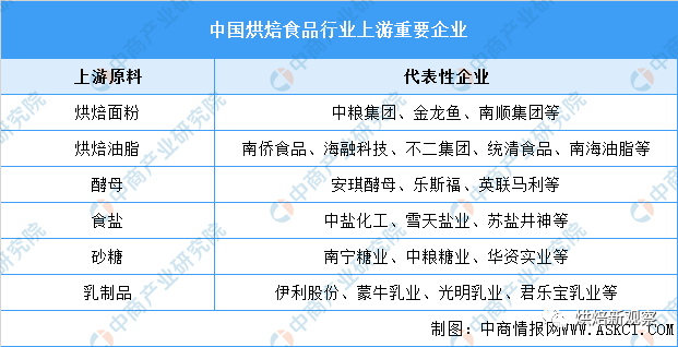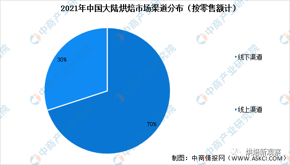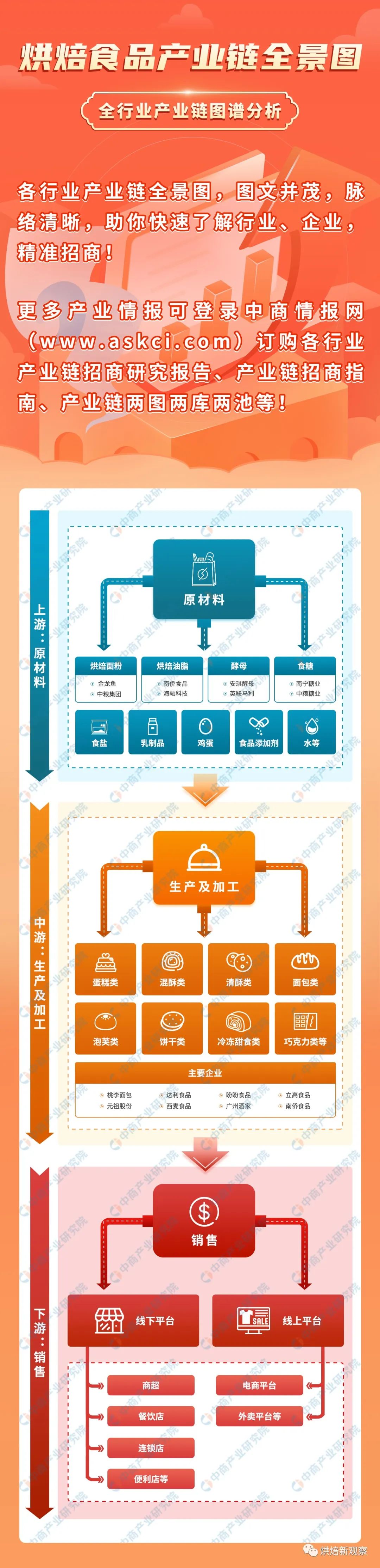 烘焙食品产业链上游包括烘焙面粉、烘焙油脂、食盐、砂糖、乳品、鸡蛋、水等原材料,中游可分为蛋糕、面包、甜点、饼干等,下游销售渠道包括商超、餐饮店、连锁店、便利店、线上平台等。
