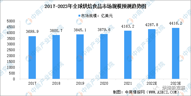 在全球范围内,烘焙食品因其美味、便捷、健康等优势,深受各国消费者的喜爱,吐司、面包、饼干等烘焙食品已经成为人们生活中不可或缺的一部分。随着全球化的发展和人们生活水平的提高,全球烘焙食品的市场规模也在逐年提升。根据相关数据统计,2021年全球烘焙食品市场规模达到4163.2亿美元,2017-2021年的年均复合增长率约为3.0%,预计2023年全球烘焙食品市场规模将达到4416.2亿美元。