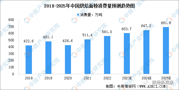 面粉是制作烘焙食品最主要的生产原料之一,根据蛋白质含量,面粉可以分为低筋面粉、中筋面粉和高筋面粉三类。近年来,我国烘焙产业发展迅速,并带动上游烘焙面粉行业快速发展,使烘焙面粉消费量呈现稳健增长的态势。数据显示,2022年中国烘焙面粉消费量约为561万吨,近五年年均复合增长率达到7.34%,预计2023年国内烘焙面粉消费量将达到691.8万吨。