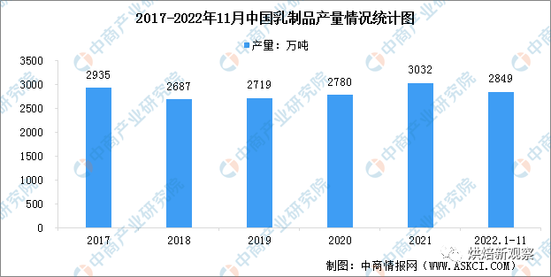 乳制品指的是使用牛乳或羊乳及其加工制品为主要原料,加入或不加入适量的维生素、矿物质和其他辅料,使用法律法规及标准规定所要求的条件,经加工制成的各种食品,也叫奶油制品。近年来,乳制品行业增长稳健。数据显示,2022年11月全国乳制品产量为272万吨,同比增长4.5%;2022年1-11月全国乳制品产量2849万吨,同比增长2.8%。