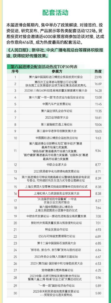 全年累计曝光量超百亿次,进博会官网全年总访问量超10亿人次,境内外多渠道传播累计覆盖约20亿人次……2024年1月9日,被称为进博会传播影响力“年终成绩单”的《第六届中国国际进口博览会传播影响力报告》在国家会展中心(上海)正式发布,进博故事、展商展品、配套活动、媒体机构等一批传播热度榜单同时公布,其中,上海虹桥人力资源服务全球发展大会位列配套活动热度TOP30。
