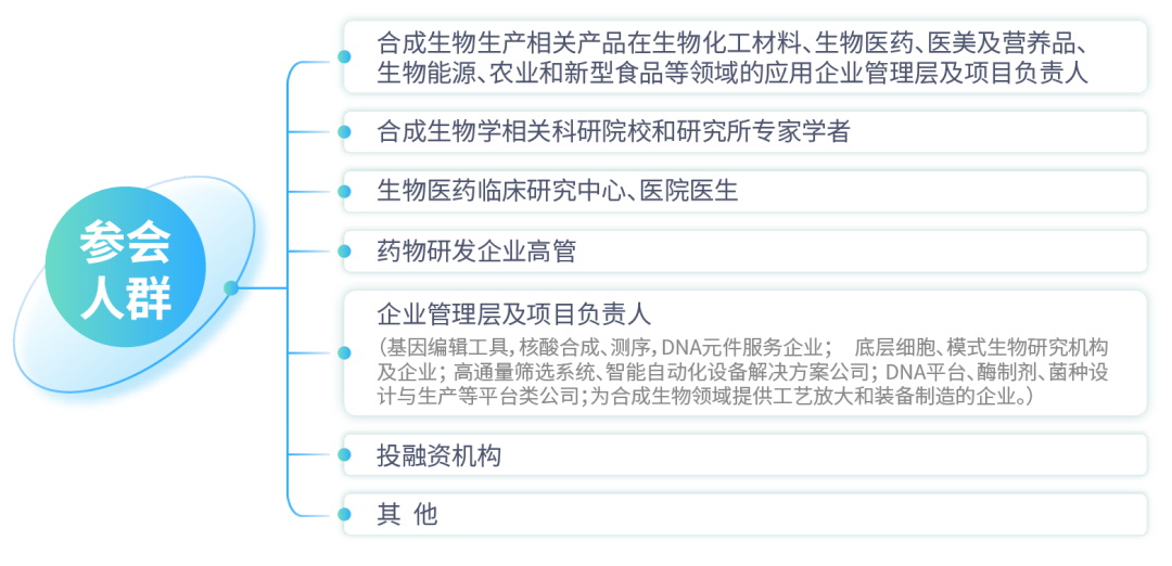 2024第二届合成生物学产业博览会现场特设11大主题专场、120+展览展示,涵盖合成生物学产业链上中下游,展品范围如下: