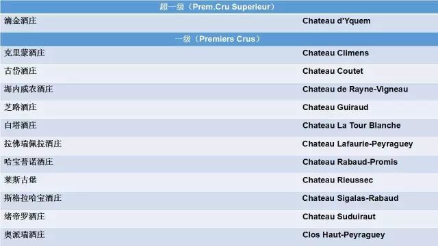 这里值得注意的是,在此后的100多年里,分级表出现过两次变化,分别是1855年9月,佳得美酒庄(Cantemerle)补选为五级酒庄;1973年6月, 木桐酒庄 (Chateau Mouton Rothschild)从原本的二级庄晋升为一级庄。但随着历史的发展变更,一些酒庄经历了拆分与合并,还有一些酒庄没落消失,1855分级从最初的58家酒庄变成了如今的61家,具体分级如下:1855年,当时法国盛行甜葡萄酒,苏玳地区的甜白葡萄酒酒庄就将葡萄酒最终分为三级,所以在以下列表中你是看不到一家干白葡萄酒的酒庄。