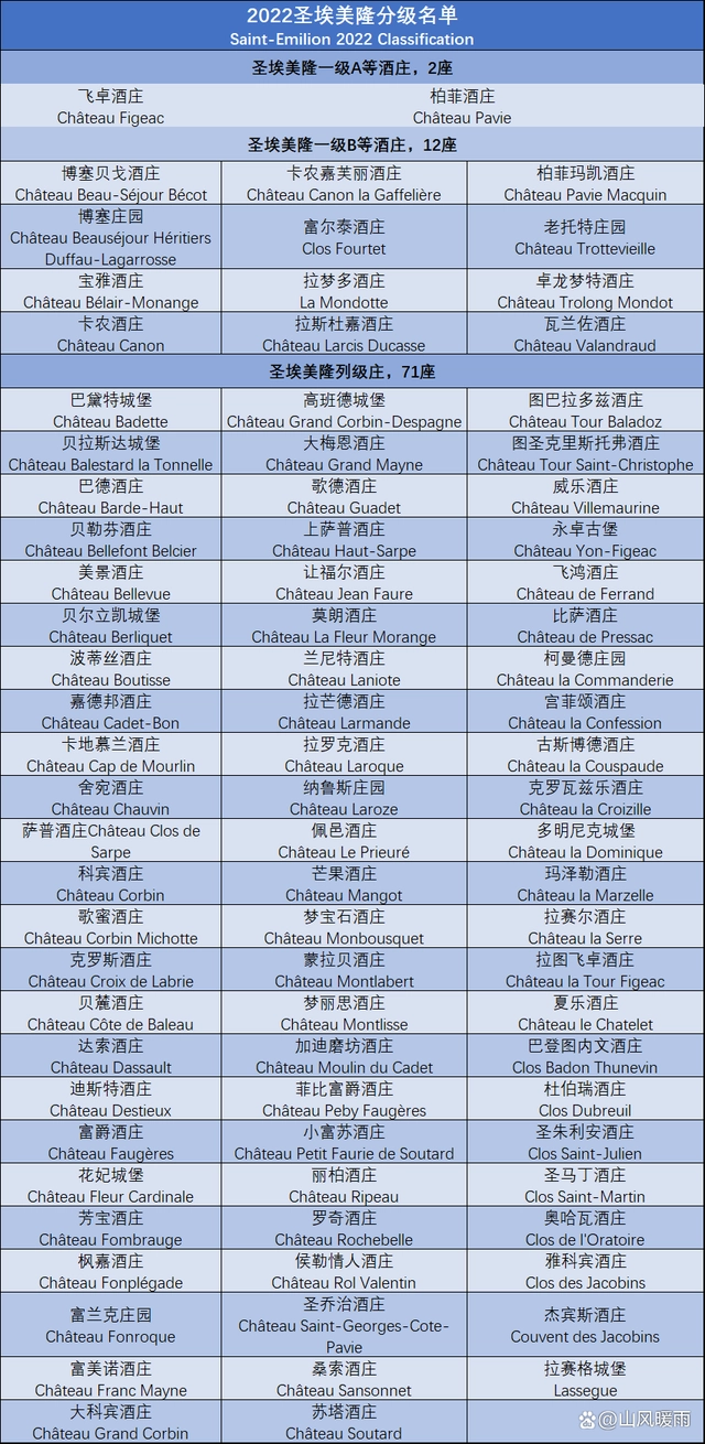 超一级庄(Premier Cru Superieur)1959年格拉夫酒业公会对1953年的分级进行了补充修订,这份列表只区分红、白葡萄酒,列级酒庄之间不再区分不同等级,即只有一个级别——列级(Grand Cru Classe)注:拉维尔-侯伯王酒庄和拉图尔-侯伯王酒庄现都隶属于美讯酒庄。1855年的分级制度没有将波尔多右岸地区的酒庄编制入内,所以上世纪50年代,圣埃美隆的葡萄酒商会建立了自己的列级酒庄分级制度。后来该制度经过多次修改,目前最新的列级酒庄分级制度就是以下2022年出台的版本。2022年9月8日,法国国家原产地命名与质量监控院(Institut National de l'Origine et de la Qualite,INAO)公布了最新的圣埃美隆分级度名单,共有85座酒庄入选。以下为入选分级的酒庄名单:一级A等酒庄变为2座,飞卓晋升,白马、欧颂、金钟未参与评级,在最新的2022年圣埃美隆分级名单中,最显著的变化来自圣埃美隆一级A等酒庄,由2012年分级的4座变成了2座。在2012年分级中的4座一级A等酒庄中,除柏菲酒庄(Chateu Pavie)外,欧颂酒庄(Chateau Ausone)、白马酒庄(Chateau Cheval Blanc)、金钟酒庄(Chateau Angelus)都在此前相继宣布退出分级。