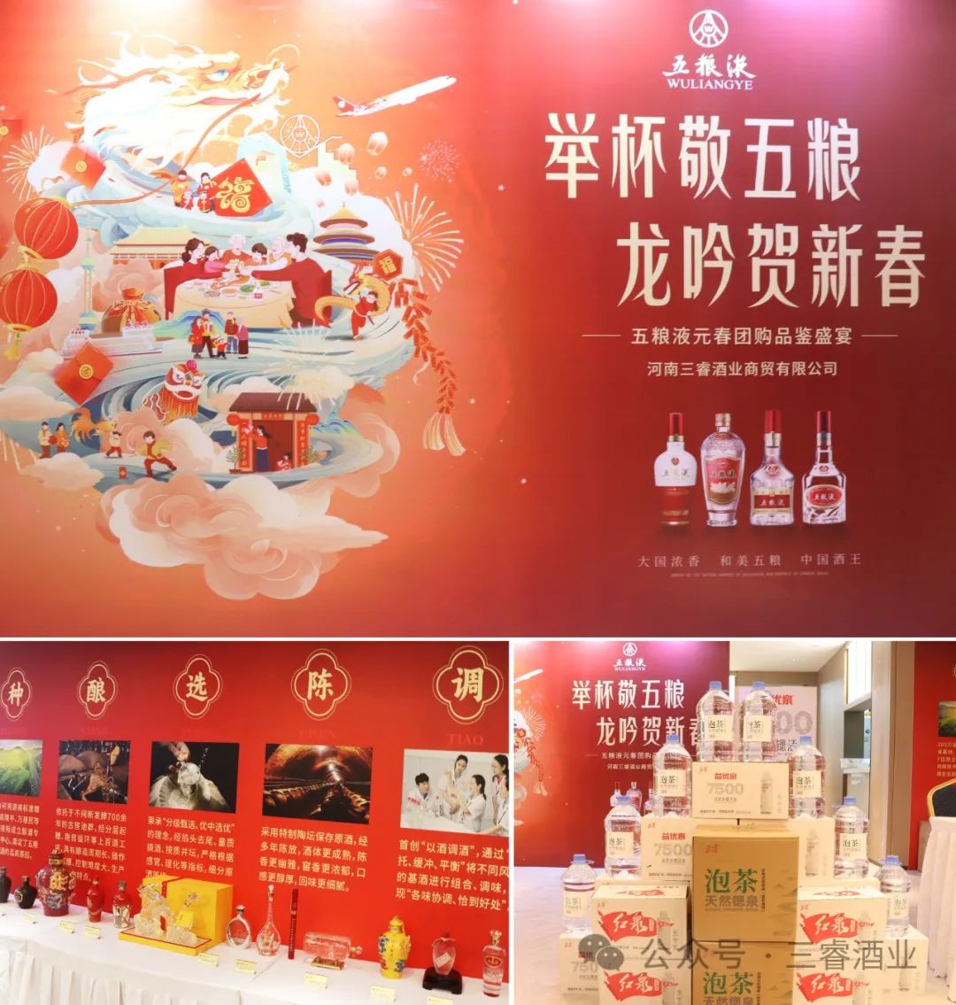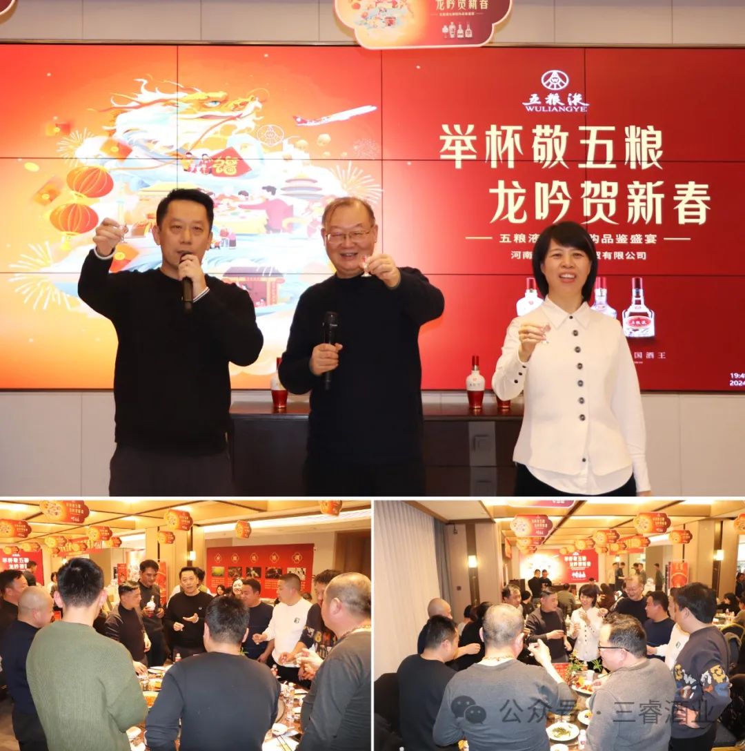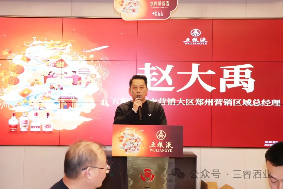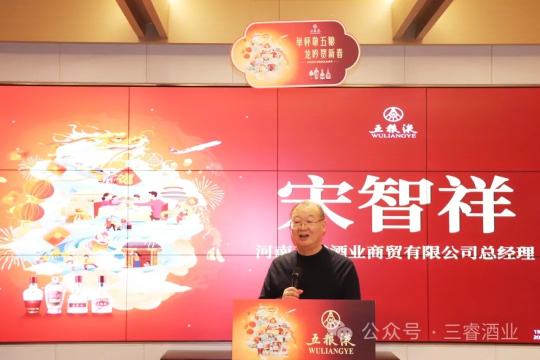 举杯敬五粮,龙吟贺新春。河南三睿酒业商贸有限公司总经理宋智祥对大家的到来表示热烈的欢迎和衷心的感谢。不觉新春即将来临,回顾过去,我们共同经历了市场的风风雨雨,共同见证了五粮液的辉煌与荣光。在这个过程中,我们不仅收获了成功与喜悦,更建立了深厚的友谊与信任。面向未来,我们将继续携手前行,紧跟五粮液发展步伐,讲好五粮液品牌故事,卖好五粮液产品。