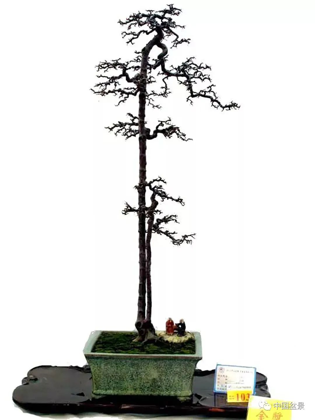 作品配用蛋形紫砂盘、矮方几架,桩、盘、架三位一体,协调统一,是不可多得之作。