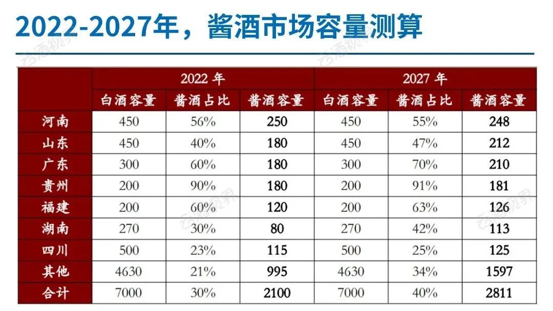 其中,在山东、广东、河南地区,随着价格带的补全、消费氛围的演变,占有率有望从40%、60%、50%更进一步提升至2027年的47%、70%、55%。在湖南地区,市场转酱进入后半场,占有率有望从30%,加速提升至42%。随着核心市场向周边辐射,除具备强势地产酒省份,预计其他市场稳中有升,2027年,非核心市场酱酒市占率有望达到34%。(招商证券)