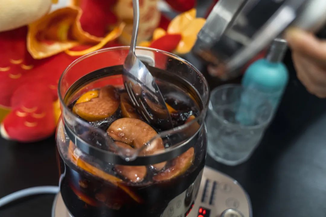 随后倒入红酒,没过水果即可,再加入适量的蜂蜜,蜂蜜替代常规的白砂糖,最后的成品就会有蜂蜜特别的香甜味。