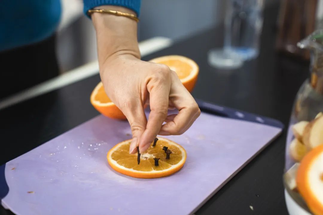 陆阿姨说:“水果要切成片,丁香需要插在水果皮上,防止等会喝到丁香。”