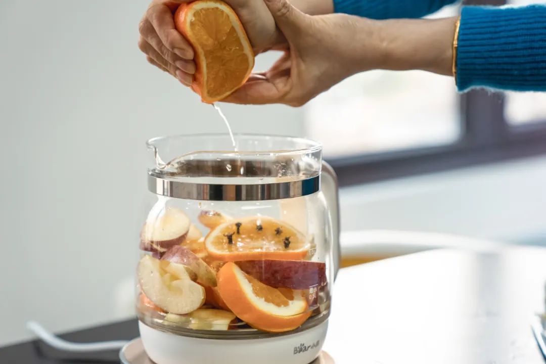 切完水果,整整齐齐码在电煮锅里,挤入新鲜橙汁,加入肉桂条,先加热到80度左右,激发出水果本身的香味。