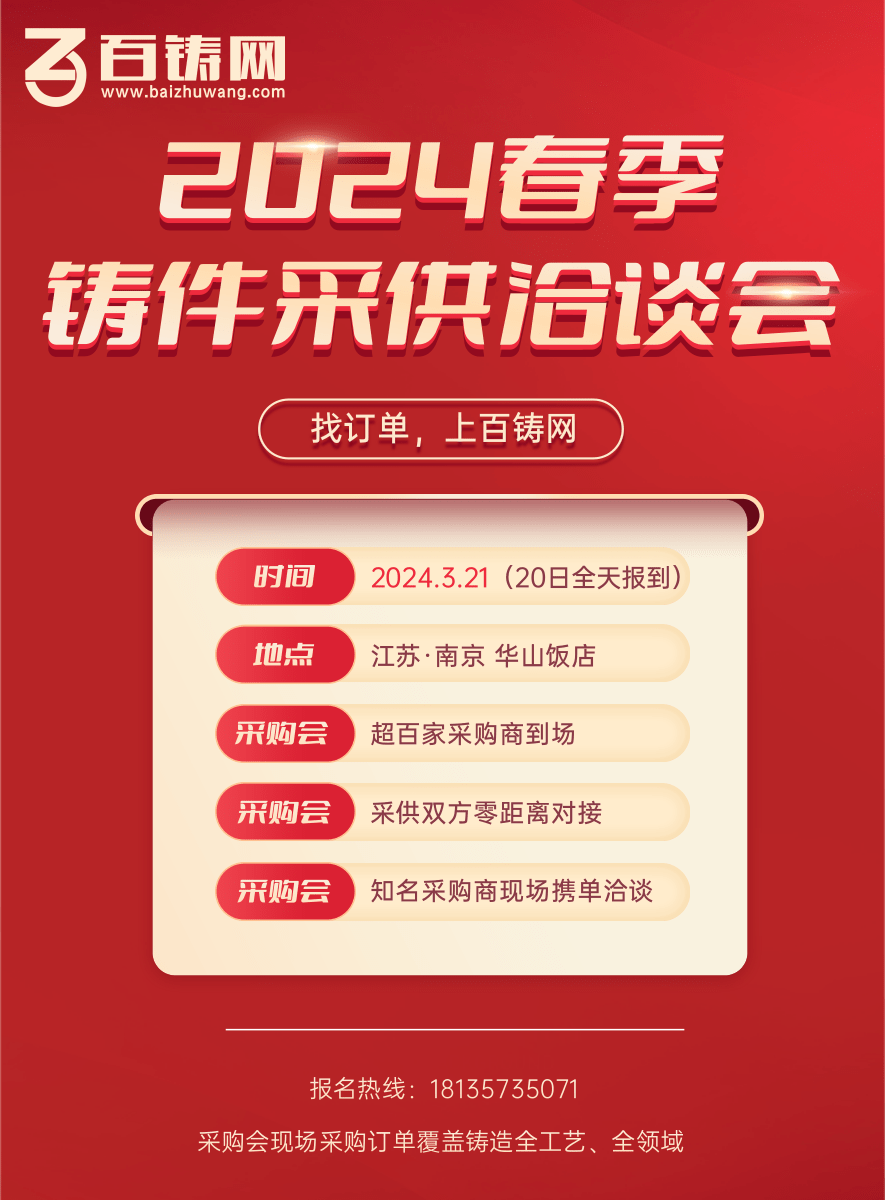 2024年3月21日,由百铸网--百铸订单主办,2024春季铸件采供对接洽谈会将在江苏·南京举办。本次会议将以闭合洽谈形式开展,为双方企业带来采供企业精彩演讲和对接洽谈会等内容。现场将有百家创新行业企业参展,多家企业管理者、技术专员、采购负责人将围绕铸造行业采供优势及对接技巧,分享独到见解。百家优秀铸件采购负责人亲临现场与工厂高效对接订单。想要参与的采购商和铸造工厂,请扫描下方二维码报名。主办单位:百铸网(www.baizhuwang.com) 会议时间:2024年3月20-21日 (20日全天报到)会议目的:搭建国内外铸件采购商与铸件供应商线下交流、洽谈、订单对接平台受邀对象:有铸件采购需求的国内外采购商、铸件生产工厂及铸造配套服务企业届时会有来自不同行业的采购负责人亲临现场。百铸网将通过采供对接会,打破线上沟通的局限性,提供双方企业面对面洽谈对接机会,为洽谈人员创造一个开放、自由、积极的交流环境,帮助企业积累优秀采供资源。来自汽车、农机、工程机械、装备制造、机床、泵阀、风电等多个热门行业的,超过100家采购将携带优质项目来到活动现场进行对接。2. 参会可获得品牌宣传、自媒体、海报、获得采购商关注;3. 会场特色产品展示,核心零部件现场展示,获得采购商关注;6. 与采购负责人进行深度交流,深入了解订单技术要求及图纸;1. 现场甄选优质铸造工厂,为当前采购项目寻找最匹配的供应商;2. 直接对接百铸网供应商会刊资料,更高效、精准、批量地获取供应商资源;3、现场对接铸造工厂,详细了解工厂生产优势及订单对接方向