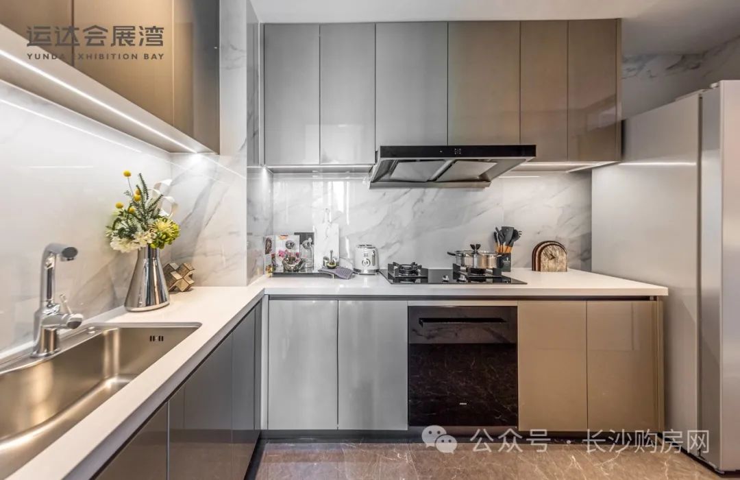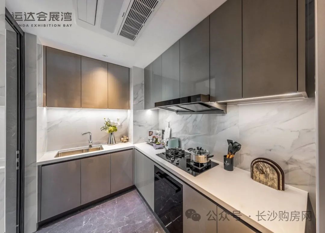 厨房配备高端整体橱柜,进口品牌厨电、专用空调、高端卫浴洁具,尽显国际生活品味。