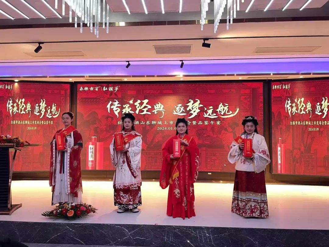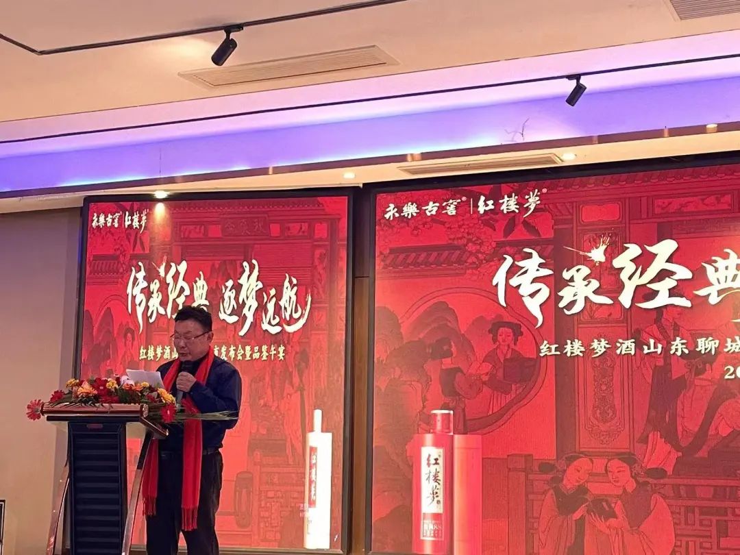 1月9日,以“传承经典,逐梦远航”为主题的红楼梦酒山东聊城上市发布会暨品鉴午宴在聊城市凯旋宫大酒店举行。