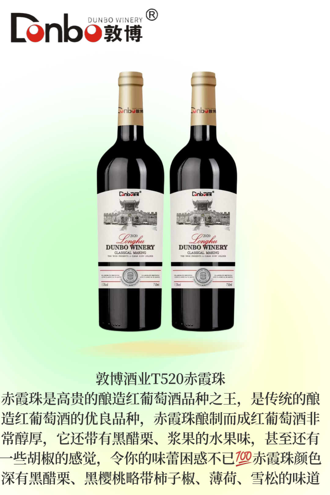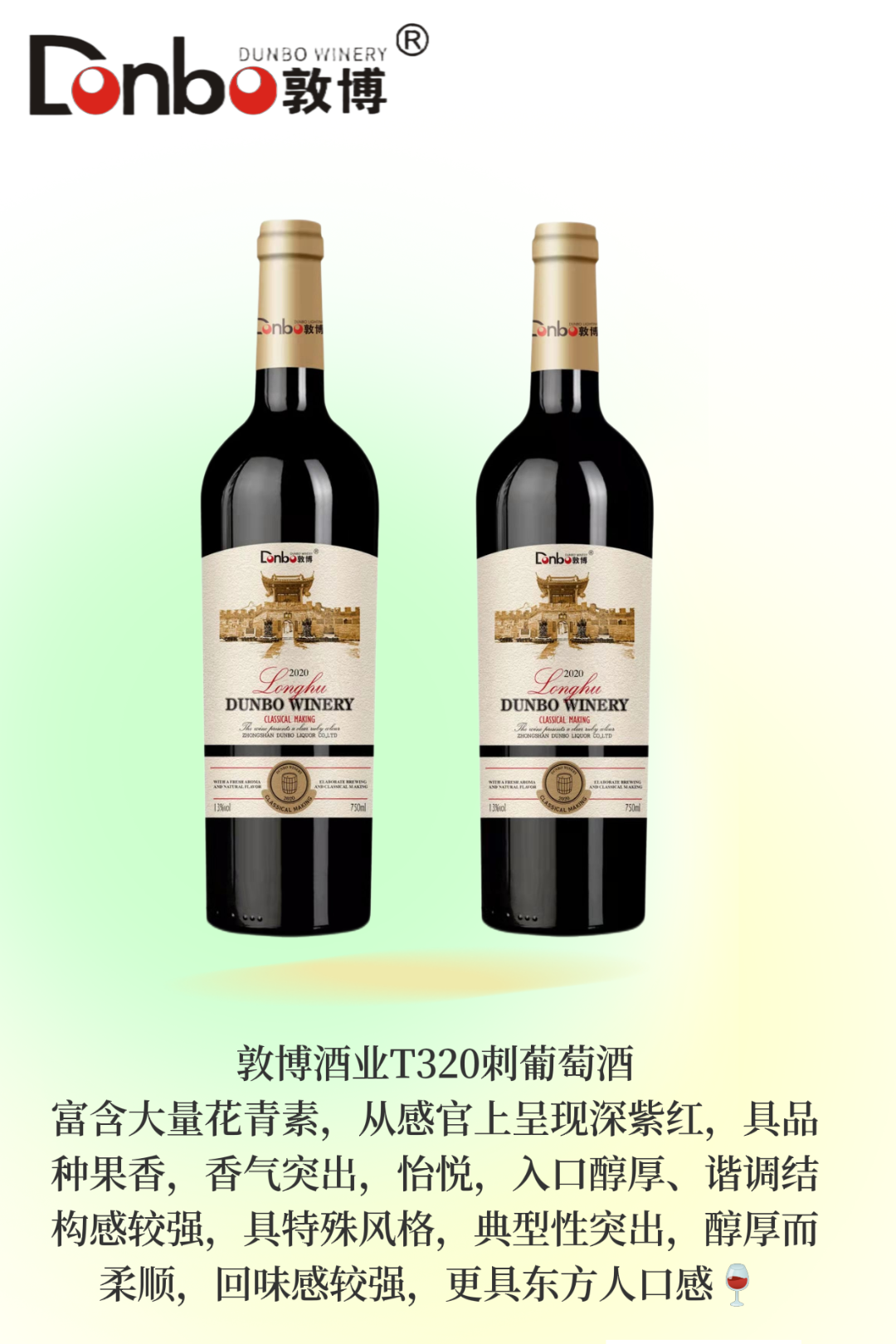 自2020年至今,敦博酒业确定国产葡萄酒自主品牌,专业为企业和个人私人定制化服务。敦博酒业将坚持匠人匠心,不忘初心,用最好的葡萄酿最醇的酒,希望身边的朋友和所有的客户朋友都能喝到纯酿葡萄酒,喝到原汁原味的葡萄酒。