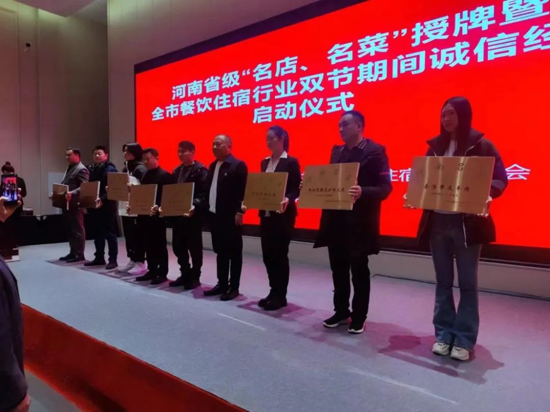 为深入贯彻落实全市文旅市场品质提升工作有关要求,促进全市餐饮住宿行业规范经营、文明经营,全面营造行业诚信经营理念,进一步推动餐饮住宿行业健康发展。1月11日下午,市商务局、市餐饮与住宿行业协会联合举行河南省级“名店、名菜”授牌暨全市餐饮住宿行业双节期间诚信经营启动仪式,邢家锅贴、红树林、大梁楼、七天连锁等40余家重点餐饮住宿企业参加仪式。15家企业和26道菜品分别获得“河南名店”“河南风味名店”“河南特色店”“河南名菜”“河南名吃”牌匾。