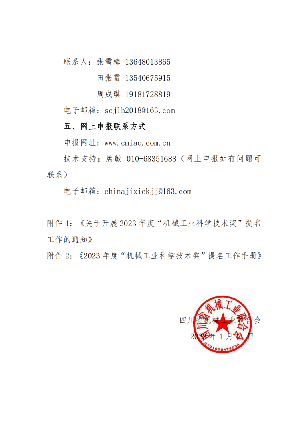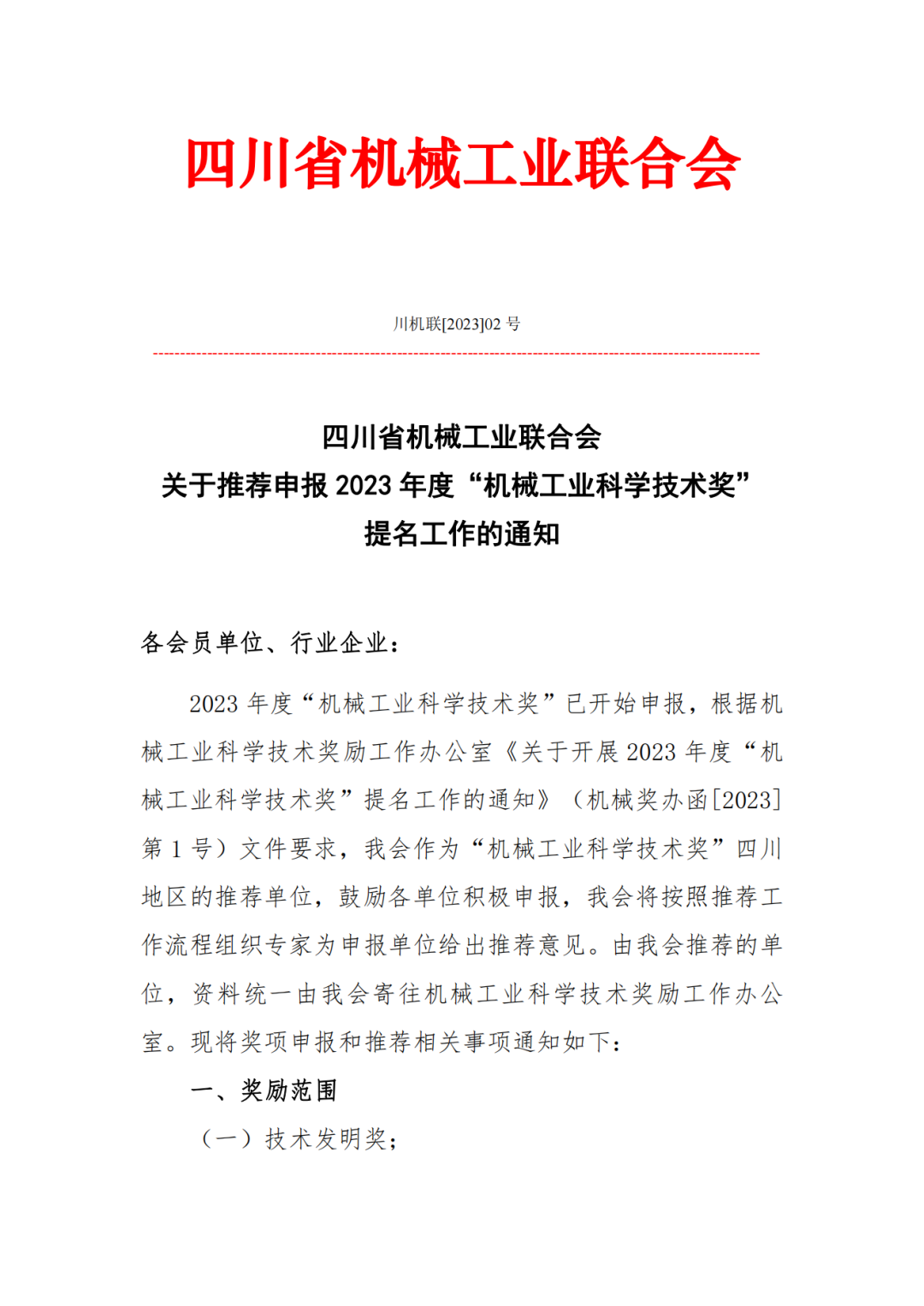 【重要通知】四川省机械工业联合会关于推荐申报2023年度“机械工业科学技术奖”提名工作的通知