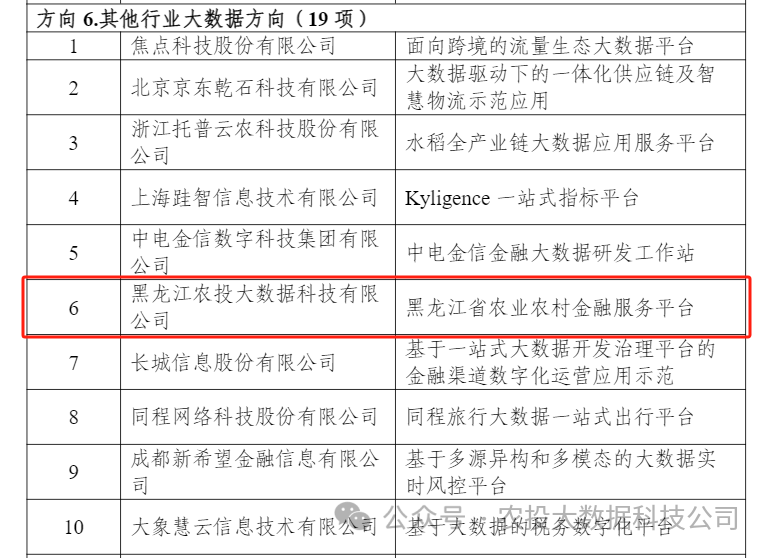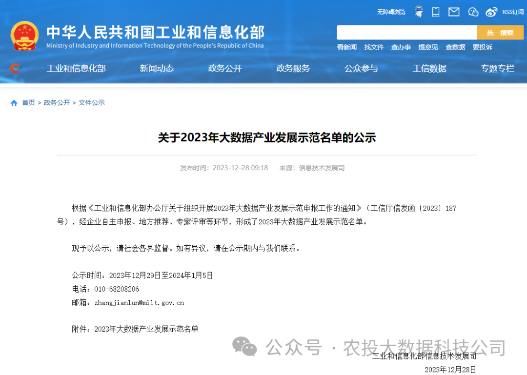 近日,工业和信息化部发布了《关于2023年大数据产业发展示范名单的公示》。根据《工业和信息化部办公厅关于组织开展2023年大数据产业发展示范申报工作的通知》(工信厅信发函〔2023〕187号),经企业自主申报、地方推荐、专家评审等环节,农投大数据公司申报的“黑龙江省农业农村金融服务平台”项目成功入选2023年大数据产业发展示范名单!