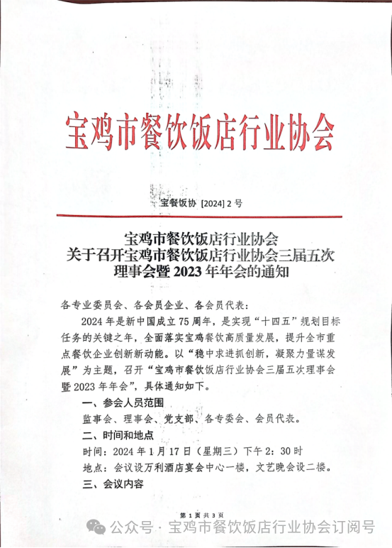 2024年是新中国成立75周年,是实现“十四五”规划目标任务的关键之年,全面落实宝鸡餐饮高质量发展,提升全市重点餐饮企业创新新动能。以“稳中求进抓创新,凝聚力量谋发展”为主题,召开“宝鸡市餐饮饭店行业协会三届五次理事会暨2023年年会”,具体通知如下。