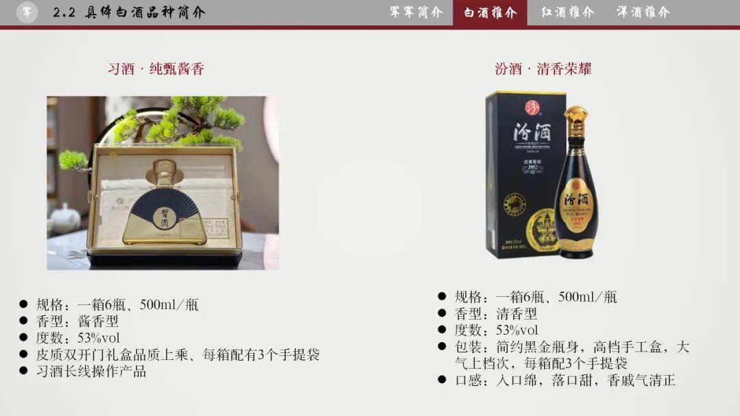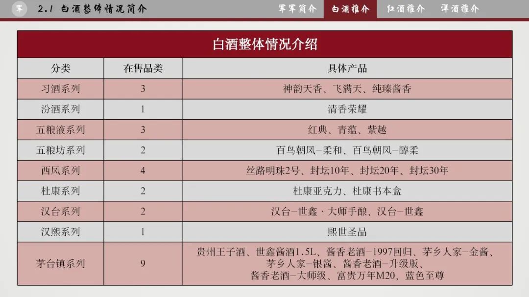 习酒、五粮液、汾酒、西凤。杜康、汉台和茅台镇产品;