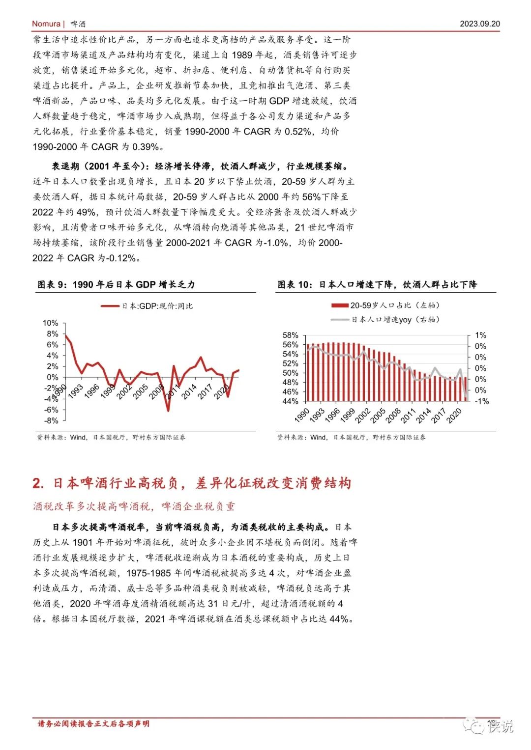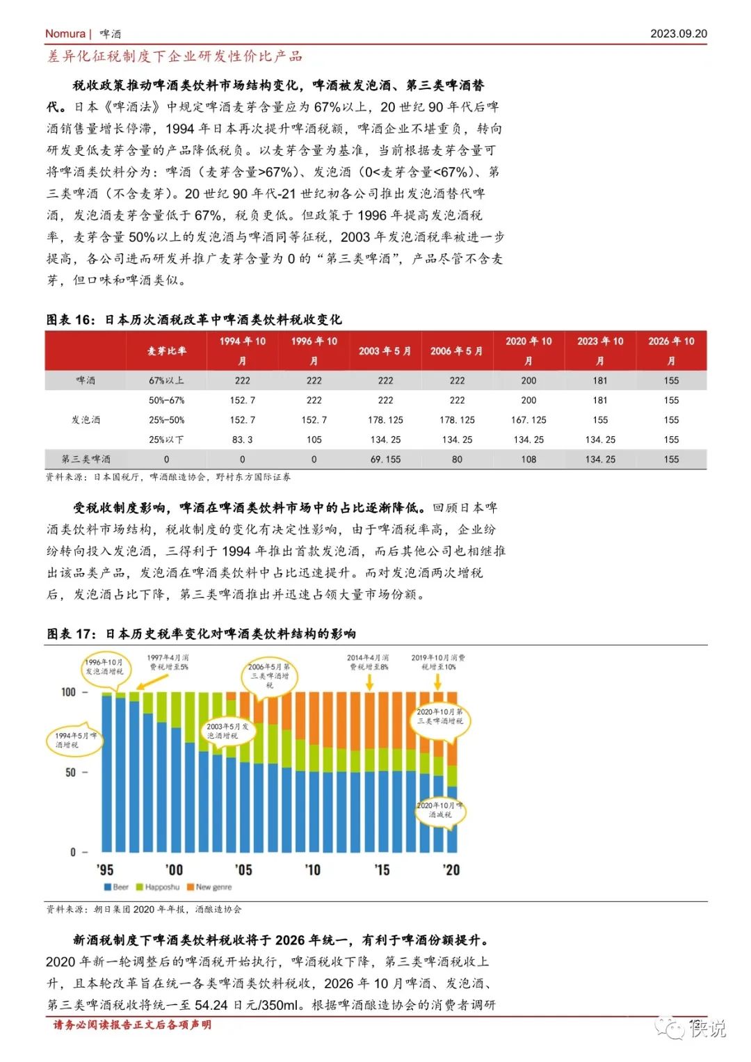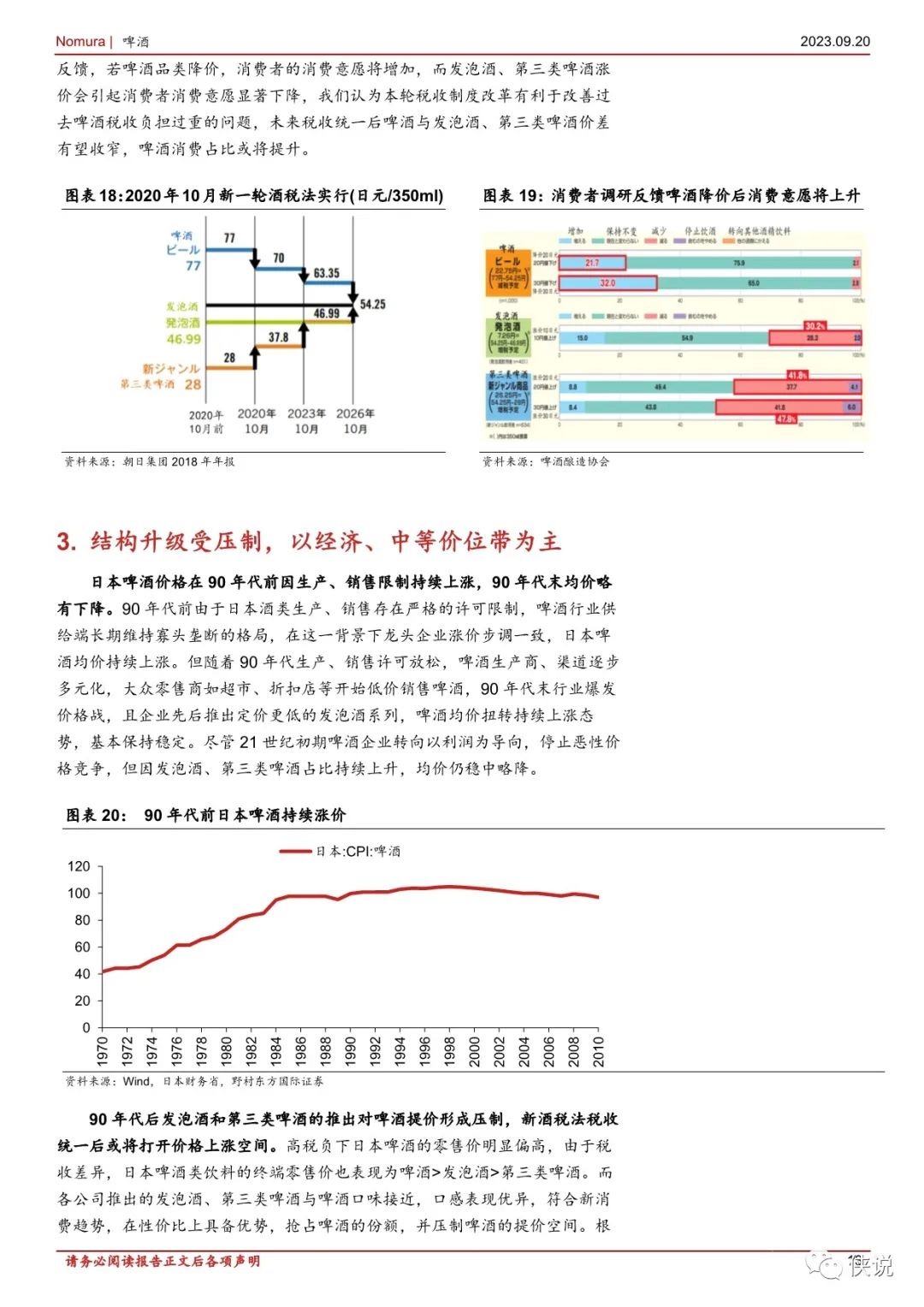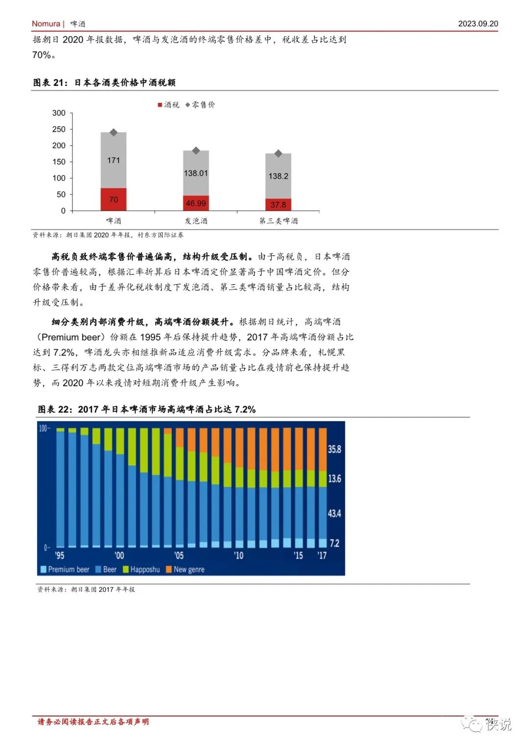 单价方面,日本啤酒 CPI 与整体 CPI 基本同步变化,近年啤酒均价同比稳中略升,我们判断主要系日本差异化税收政策分下售价更低的发泡酒、第三类啤酒占比提升拉低均价,但高端啤酒份额仍在食品提升。