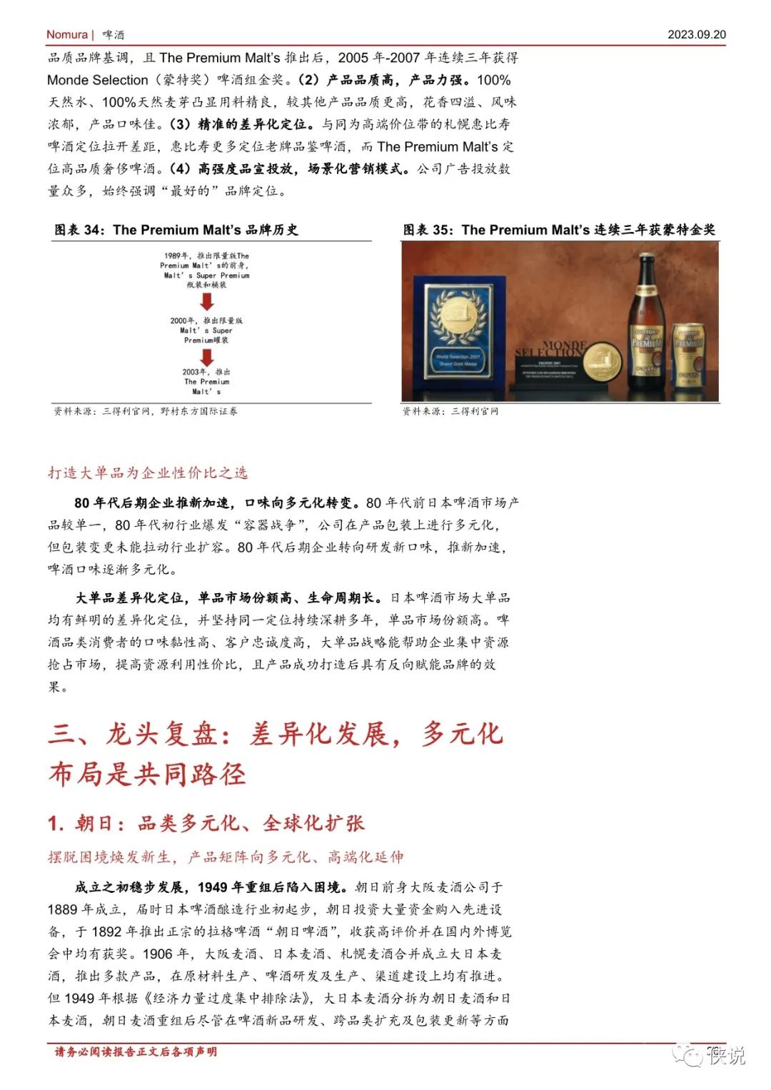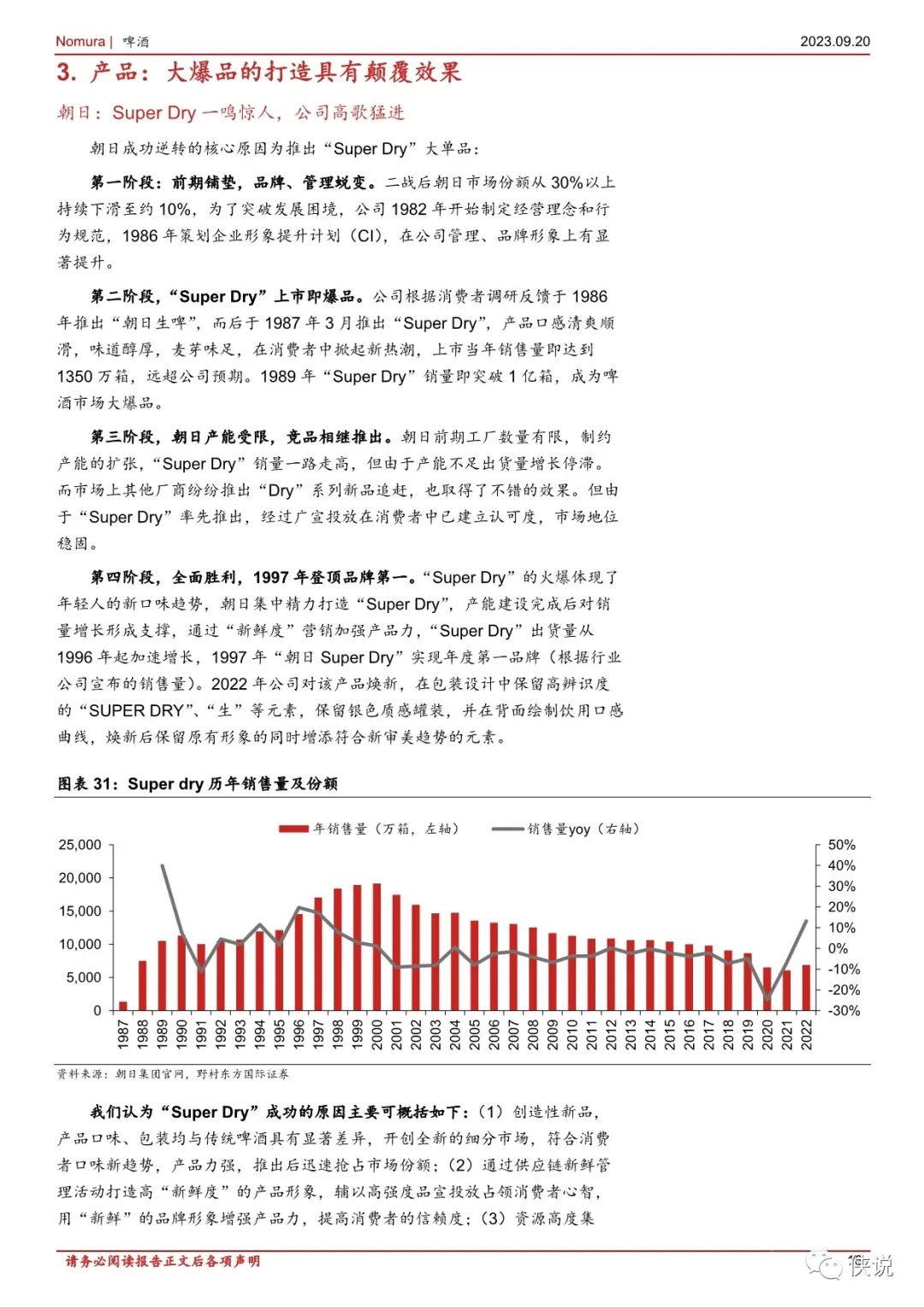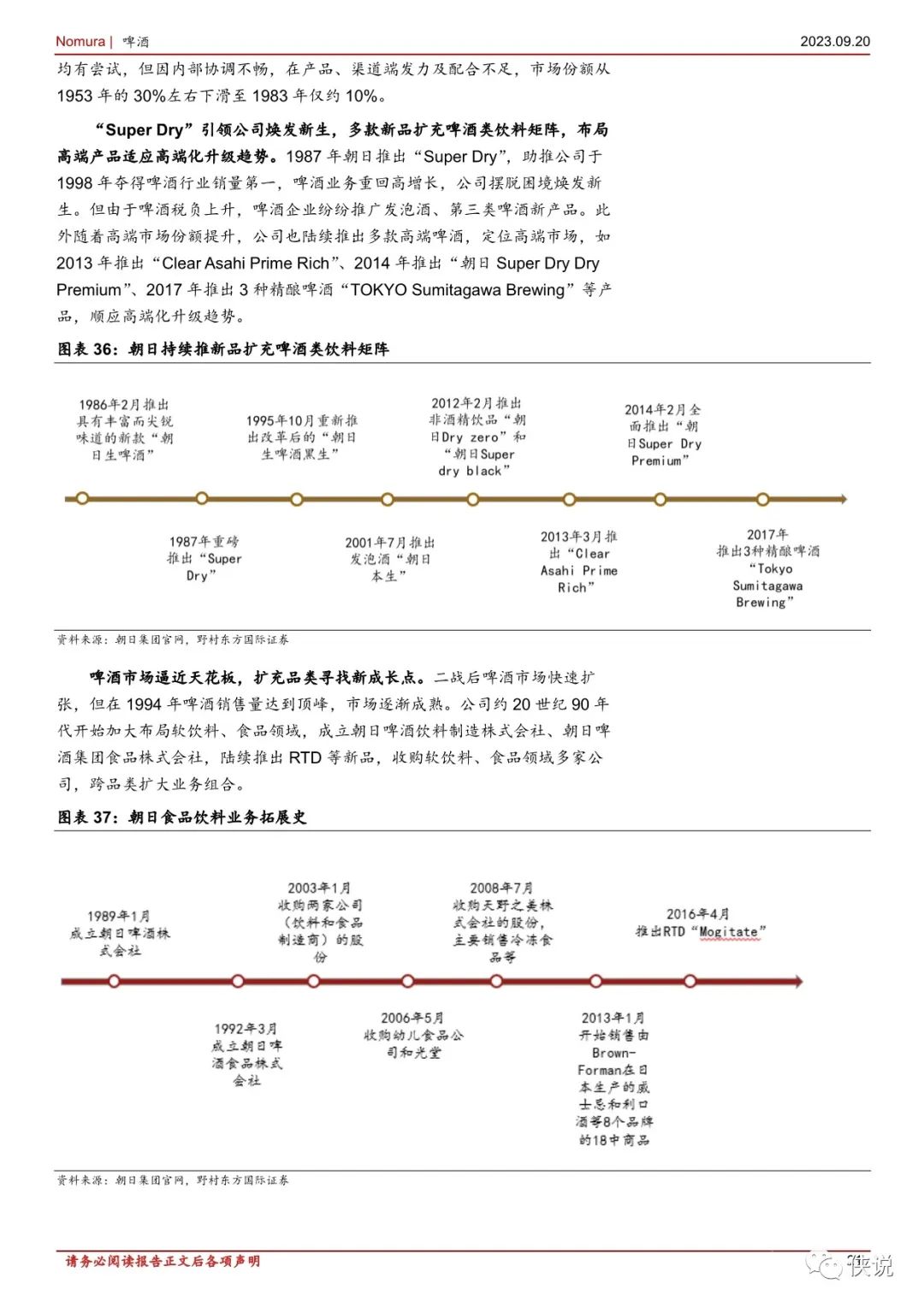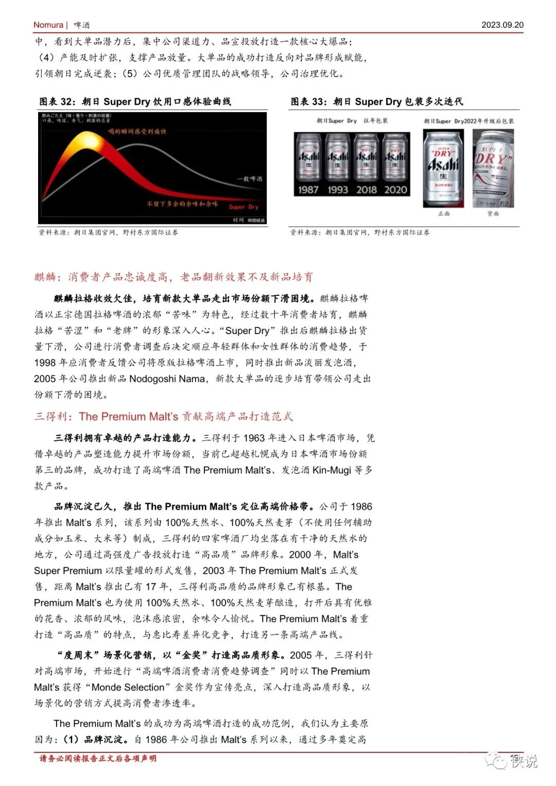 推出“Super Dry”大单品是朝日跃升为行业第一的核心原因,我们认为“Super Dry”的成功原因有: (1) 产品力强,顺应消费者需求变化新趋势;(2) 供应链新鲜管理及高强度品宣投放增强产品力: (3) 集中资源合力打造一款核心大单品的战略:(4) 产能及时扩张支撑产品放量。相比下麒麟应对市场竞争加剧时期战略调整并不及时,而在推出淡丽发泡酒、NodogoshiNama 后逐步走出了市场份额下滑的困境。我们认为大单品成长后能达到极高的市场份额,且能反向赋能品牌,甚至帮助企业完成竞争格局的逆转,打造大单品为企业性价比之选。